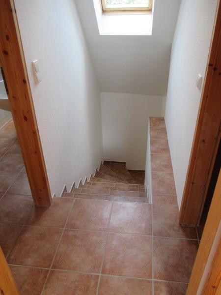 Obergeschoß, Schlfzimmer, Badezimmer mit Dusche, Wanne und Fesnter, hell gefliest, Abstellraum und ein kleiner Flur.