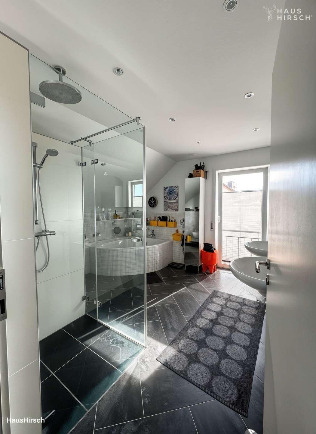 Großes Tageslichtbad mit Eckbadewanne, Regendusche & Doppelwaschbecken und Wäscheschacht