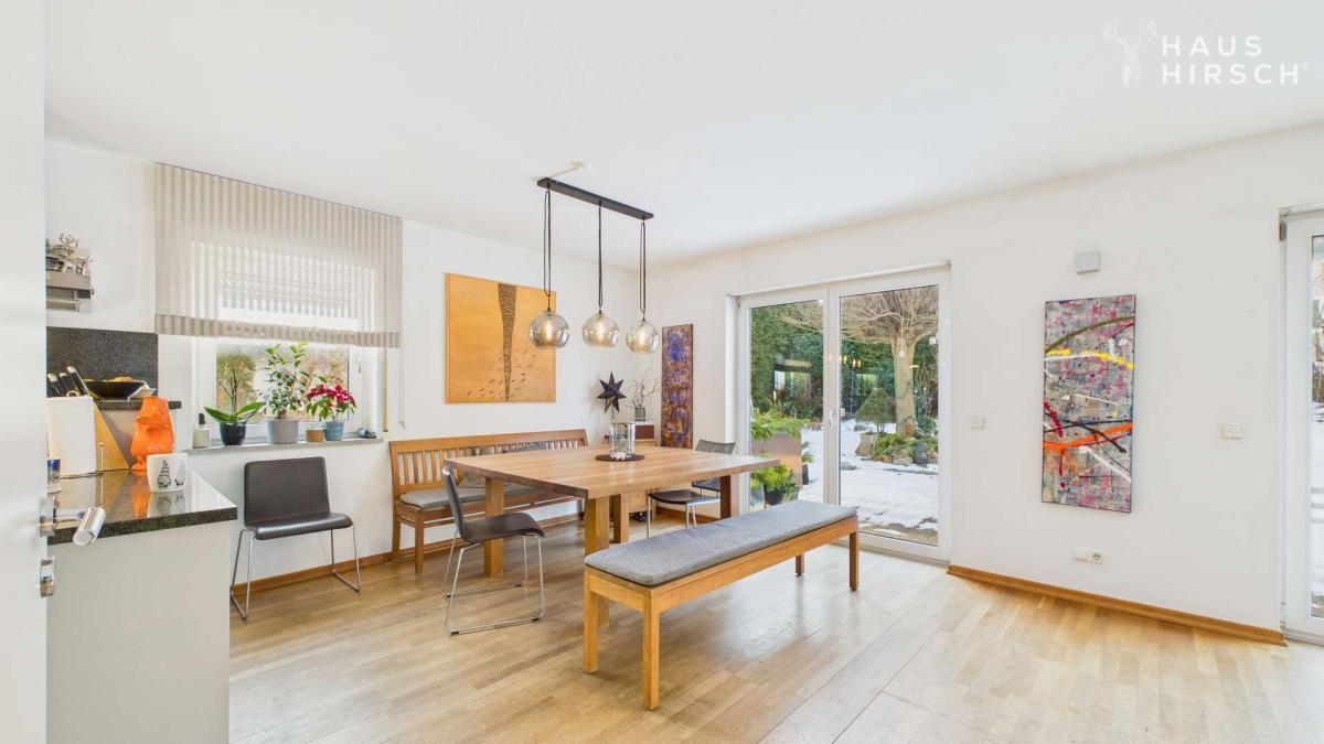 Bereits der großzügige Wohnbereich mit großflächigen Fenstern, Echtholzparkett lädt zum Ankommen ein. Der angrenzende Wintergarten mit Zugang zur Terrasse und Pool lässt sich ideal als Lounge, Essbereich oder Kreativzone nutzen – dank Beschattungssystem und großem Schiebeelement zur Gartenseite auch im Sommer angenehm kühl.