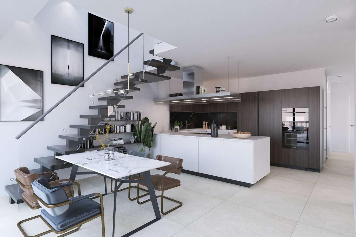 Das Herzstück bildet der offene Wohnbereich mit Zugang zur Dachterrasse – ideal, um den Feierabend entspannt zu genießen. Angrenzend befindet sich die Küche, die sich harmonisch in den Grundriss einfügt. Zwei Schlafzimmer mit einem angrenzenden Badezimmer sorgen für Komfort und Privatsphäre.