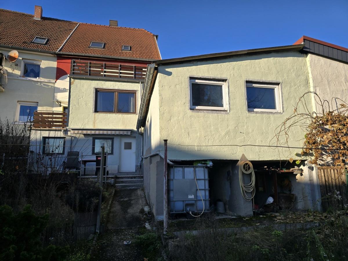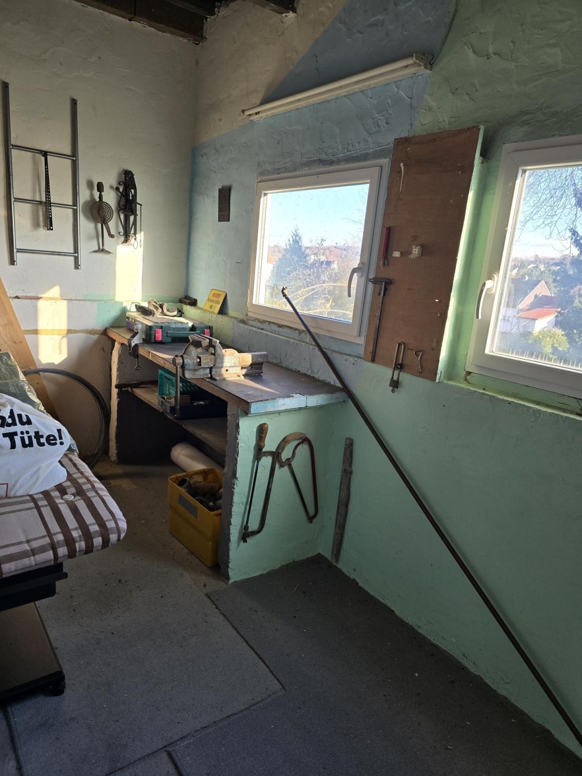 Zum Anwesen gehören außerdem eine Garage mit angeschlossenem Werkstattraum, die vielseitige Nutzungsmöglichkeiten bietet. Der überschaubare Garten verfügt über eine kleine Terrasse und lädt zum Entspannen im Grünen ein.