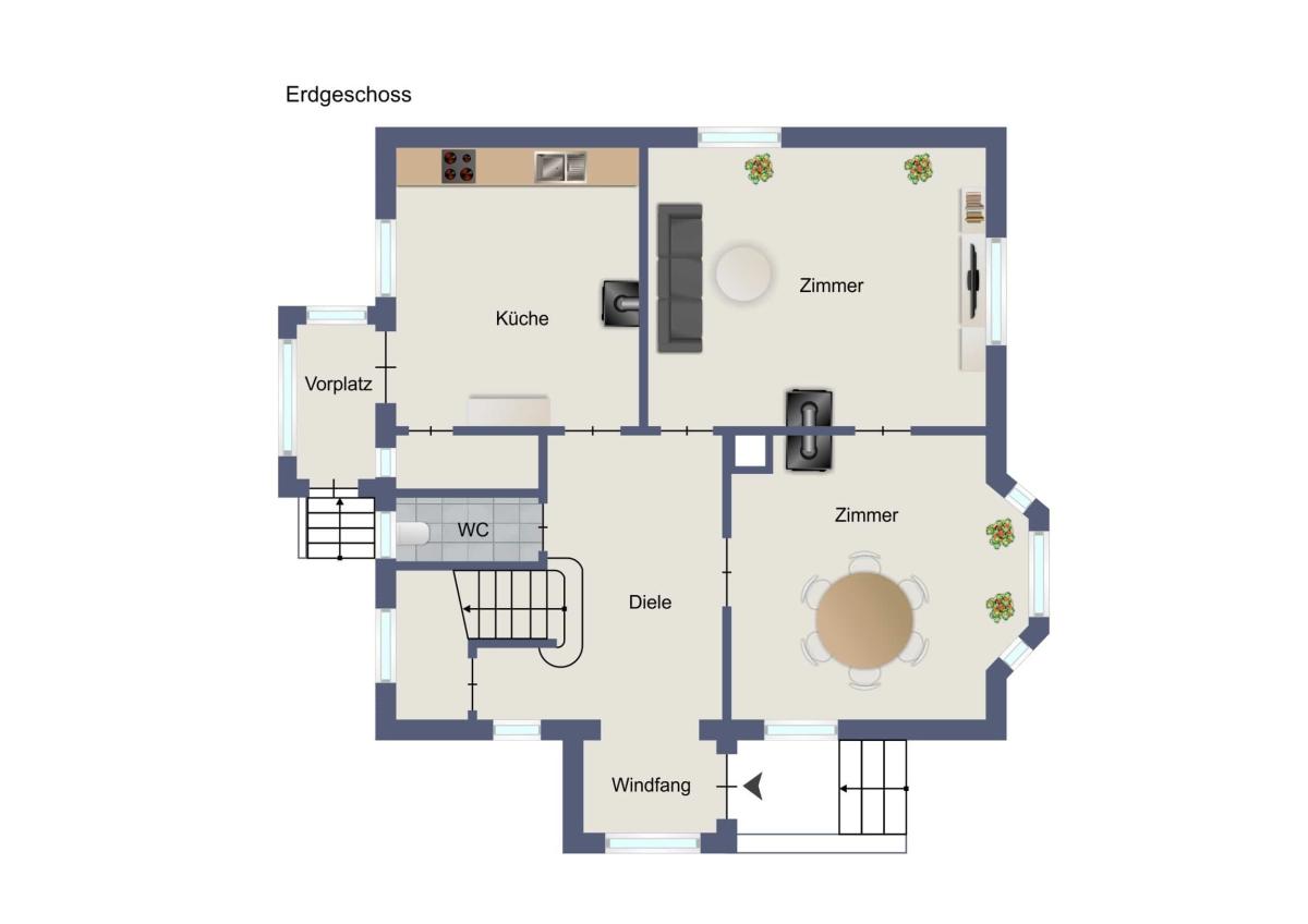 Im Erdgeschoss kommen Sie über den Windfang im Eingang in die Diele mit Treppe nach oben und unten. Die große Wohnküche mit Ausgang über eine Terrasse in den Garten, der große Wohn-Essbereich und auch ein Gäste WC sind ebenso über die Diele zugänglich.