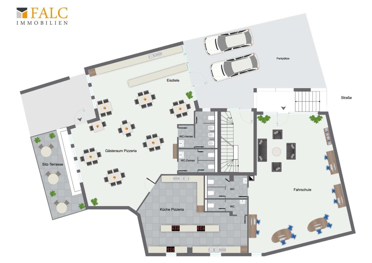 Der Innenbereich umfasst einen großzügig angelegten Hauptgastraum, der eine angenehme und einladende Atmosphäre bietet. Ergänzend steht im Hinterhof ein kleiner Außenbereich als Gästeterrasse mit zusätzlichen Sitzplätzen zur Verfügung – ideal für den Outdoor-Betrieb an warmen Tagen.
