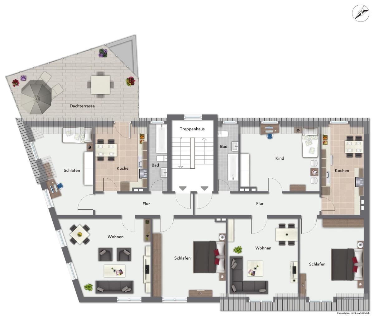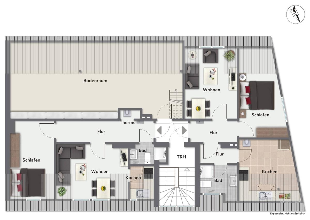 Weitere Ausstattungsdetails sind u. a. Gasetagenheizungen, Kunststofffenster mit Isolierverglasung, Balkon, Dachterrasse,ein großer Garten sowie eine Garage.