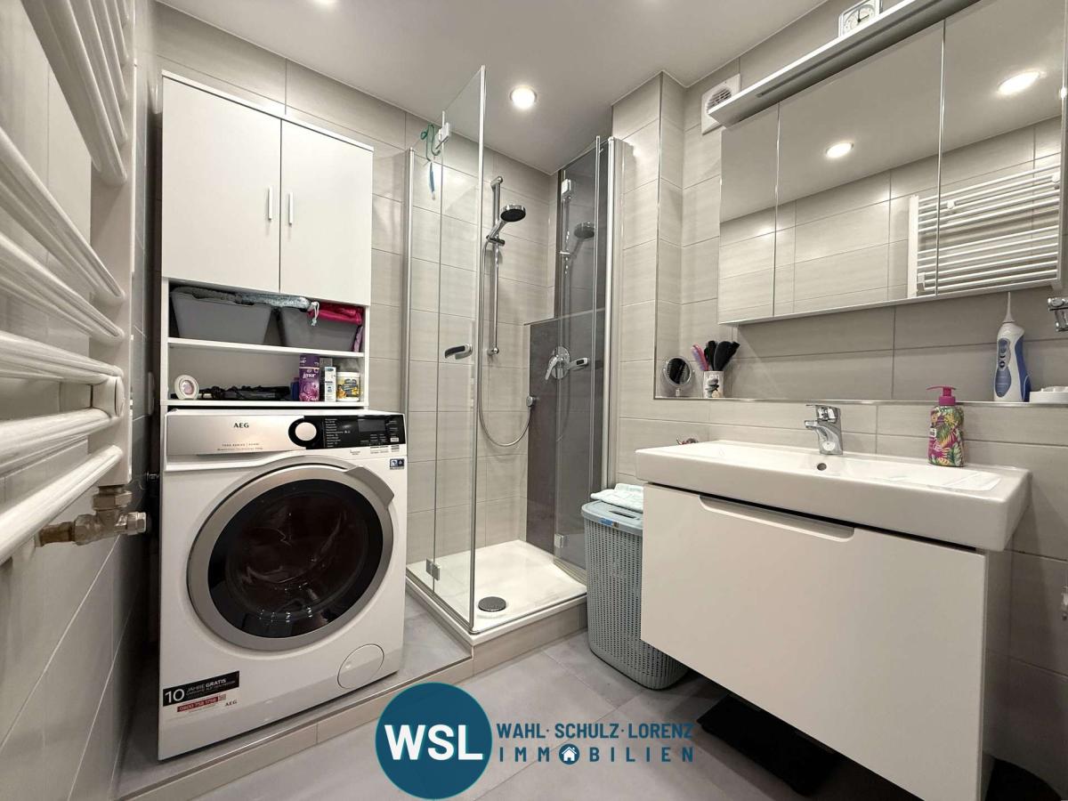 Sanitär: Bad mit Dusche, Waschbecken, Waschmaschinenanschluss (innenliegend, 2022 neu), separates WC (innenliegend, 2022 neu)