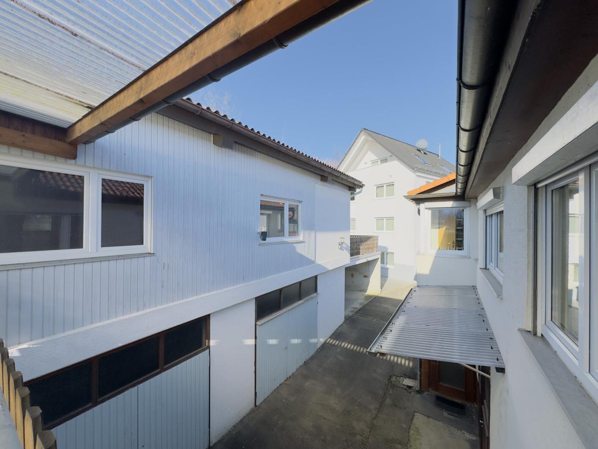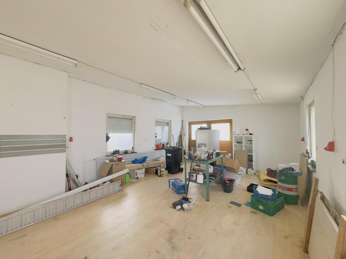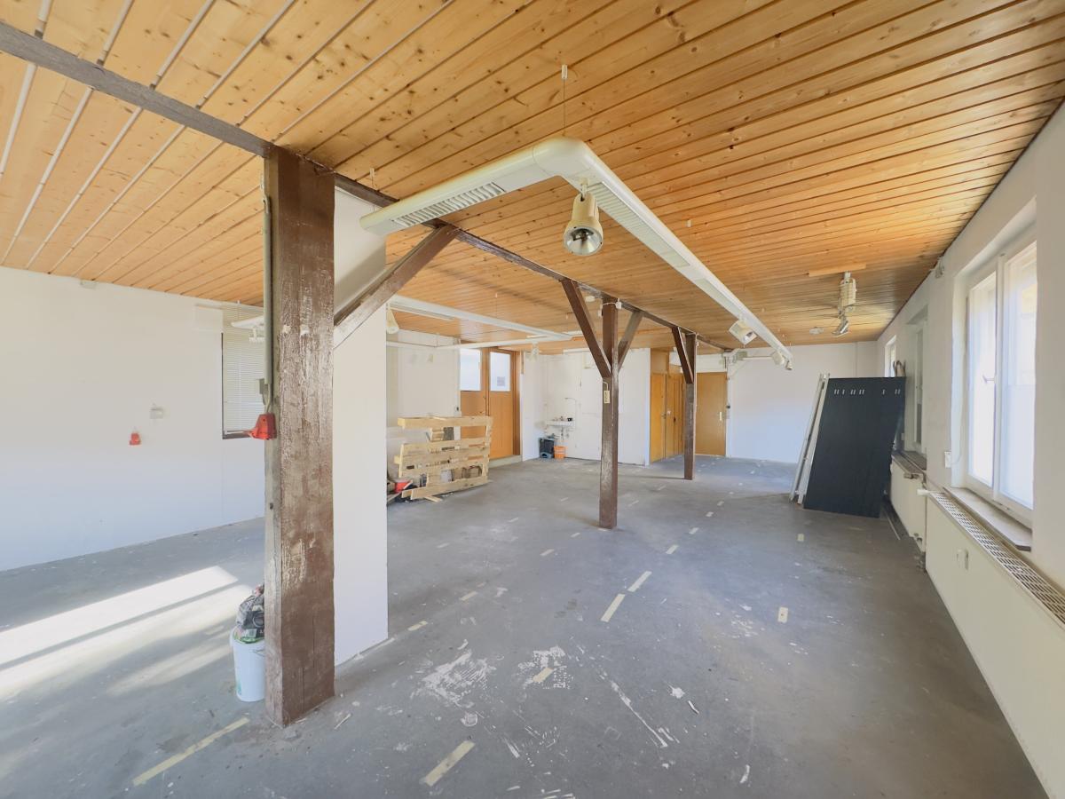 Im Erdgeschoss des Ensembles befindet sich eine ehemalige Schreinerei mit weitläufigen Lager-, Produktions- und Werkstattflächen. Die Dimensionen eröffnen vielfältige Möglichkeiten:
