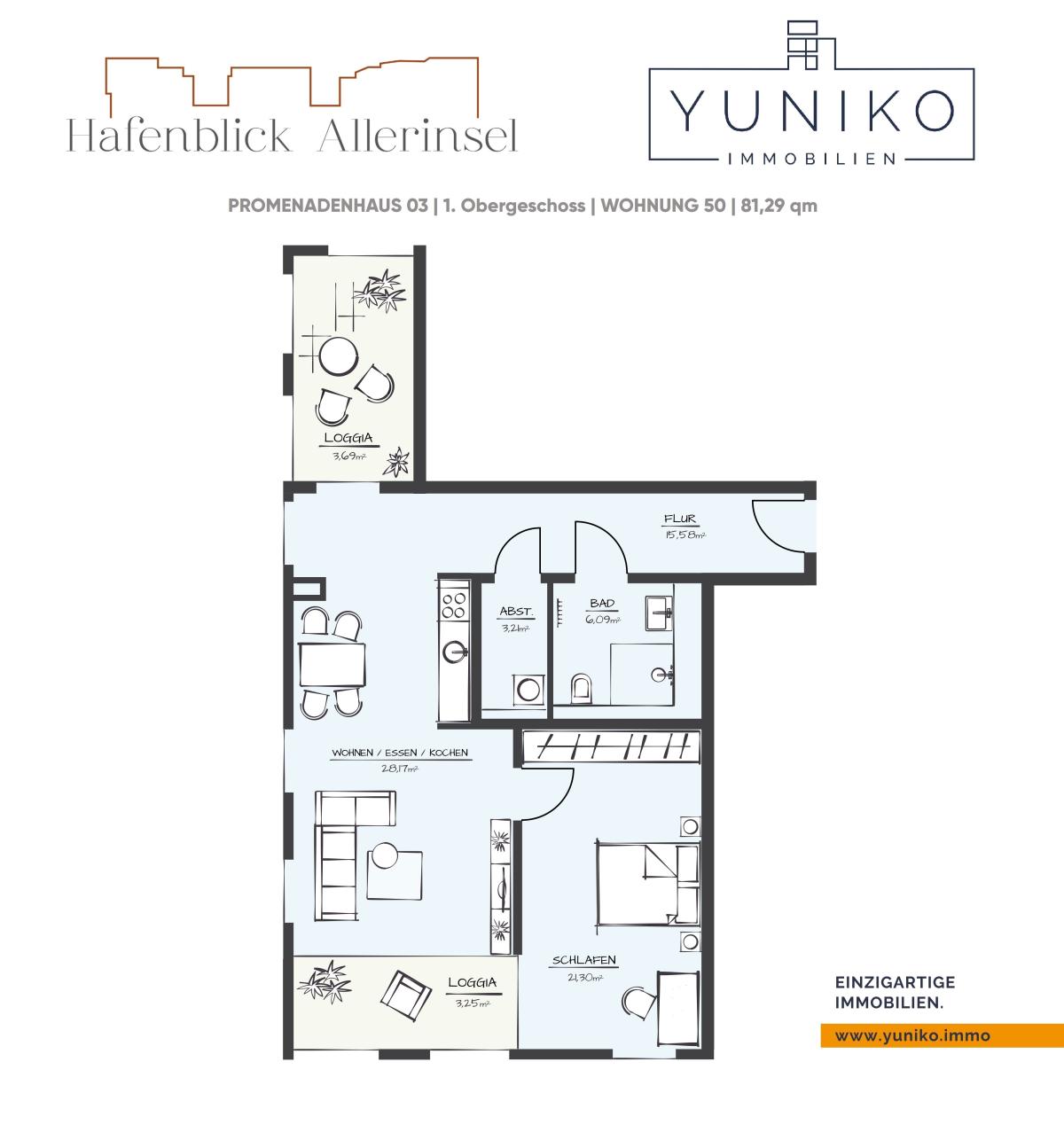 Gleich zwei Balkone/Loggien, jeweils mit Blick auf die Aller bzw. den Hafen, ein offener Küchenbereich, über den Sie in den Wohnbereich gelangen, und das große Schlafzimmer ergeben ein schönes und ruhiges Wohnen.