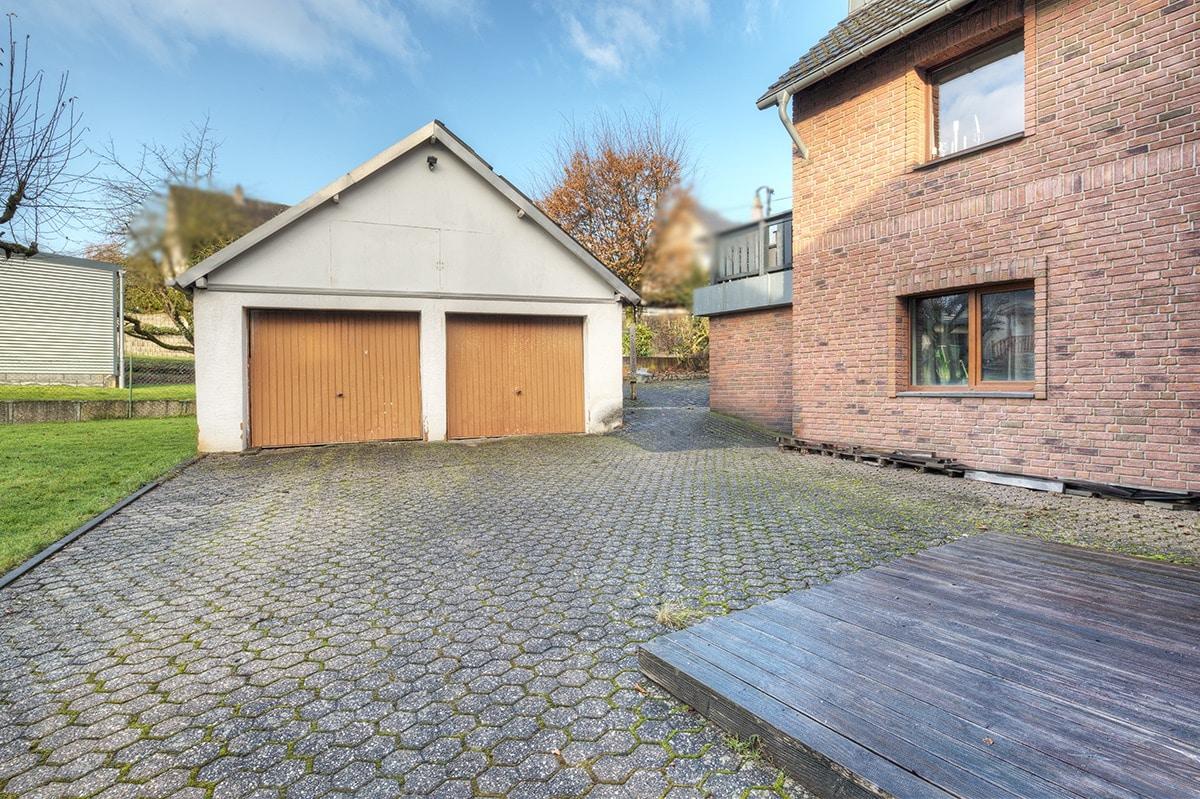 Das Grundstück verläuft spitz nach hinten und bietet neben einer Doppelgarage für Fahrzeuge oder Hobbies eine Gartenhütte und Platz für die Kinder zum Spielen und Gärtnern.