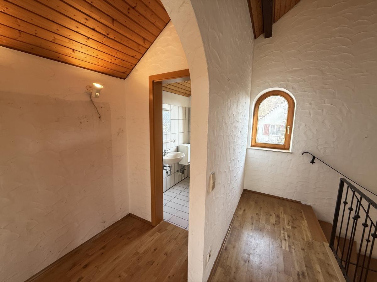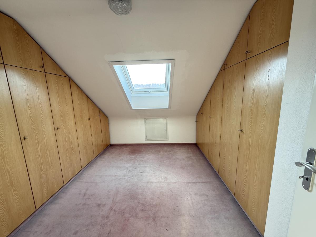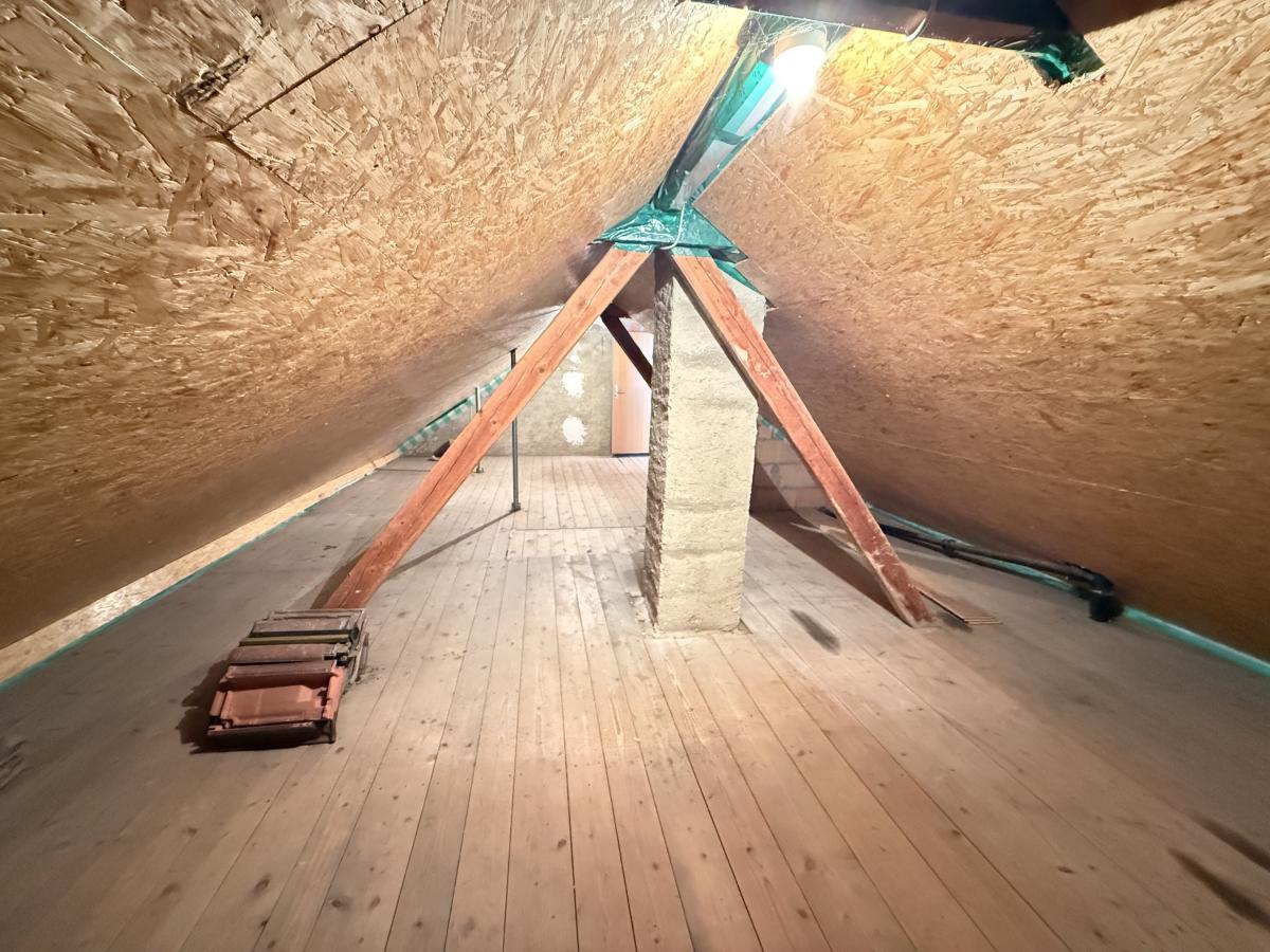 Das darüberliegende Stockwerk umfasst einen großen, unausgebauten Bühnenbereich, einen Garderobenbereich, in welchen bei Bedarf eine Dusche eingebaut werden kann und somit als weiteres Bad mit WC zur Verfügung steht. Momentan ist im Dachgeschoss bereits ein WC vorhanden. Zudem gibt es dort ein großes, helles Dachgeschosszimmer mit überdurchschnittlicher Deckenhöhe und einer gemütlichen Dachloggia. Das Dach ist professionell gegen Wärmeverluste gedämmt und mit Tondachpfannen eingedeckt. Einige Fenster wurden bereits erneuert.