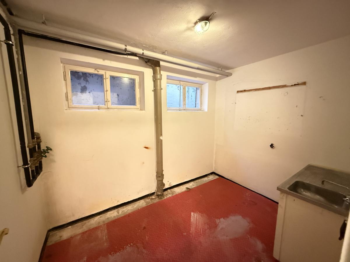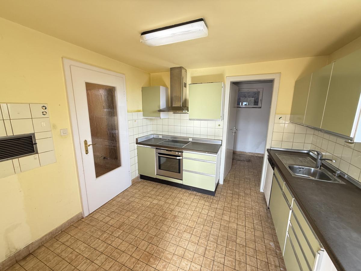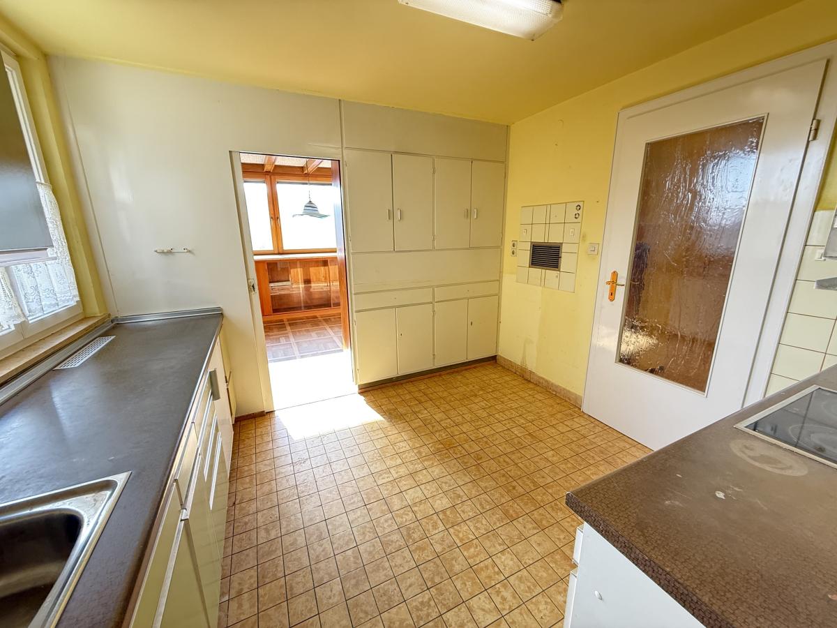 So befinden sich im Untergeschoss der Wohn- und Essbereich mit Balkon. Direkt an den Essbereich schließt sich direkt die Küche mit Speisekammer an. Der Essbereich und die Küche sind lediglich durch einen Schrank als Raumteiler voneinander abgeteilt und es könnte sehr einfach ein offener Küchen-, Ess- und und Wohnbereich entstehen. Im Wohnbereich befindet sich ein nützlicher Holzkachelofen, welcher durch Austausch des Heizeinsatzes reaktiviert und wieder genutzt werden könnte.