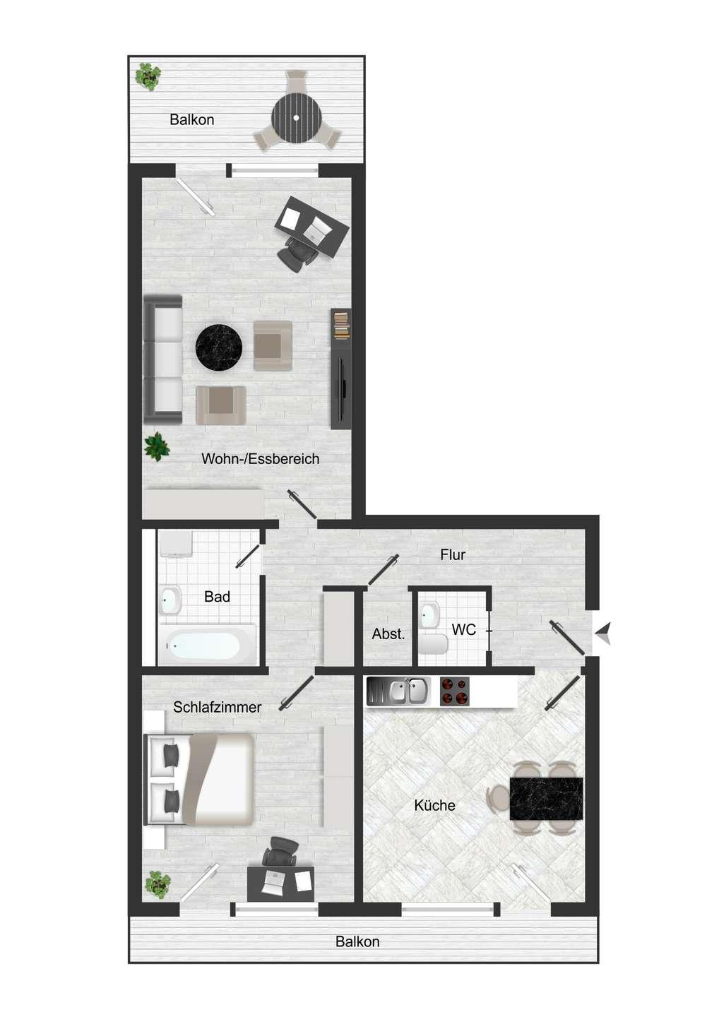 Die Wohnung ist funktional geschnitten und umfasst einen Wohn- und Essbereich, eine Einbauküche inklusive elektrischer Geräte und integriertem Essplatz, ein Schlafzimmer, einen Abstellraum sowie zwei Balkone, die den Wohnwert zusätzlich erhöhen. Das Badezimmer ist mit einer Badewanne und einem Waschbecken ausgestattet, ergänzt durch ein separates WC mit eigenem Waschbecken.
