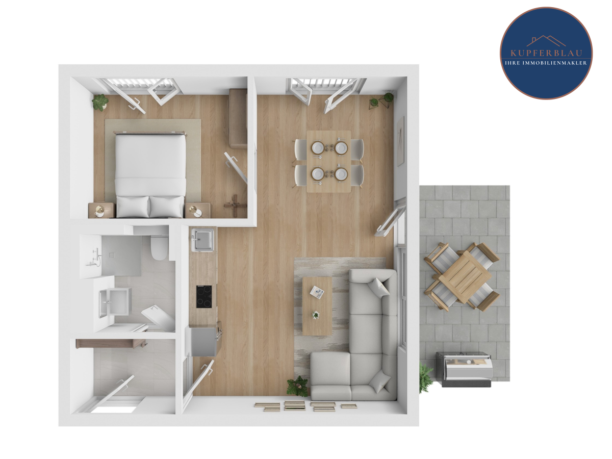 Die Erdgeschoss-Wohnung mit einer Wohnfläche von ca. 49,94 m² bietet einen durchdachten Grundriss mit einem hellen Wohn-/Essbereich, einem separaten Schlafzimmer, einem modernen Badezimmer sowie einer sonnigen und ruhigen nach hinten gelegener Terrasse, die den Wohnraum angenehm erweitert. Ein eigener Kellerraum gehört ebenfalls zur Einheit und bietet zusätzlichen Stauraum. Die auf den Fotos dargestellt Einbauküche ist im Preis inkludiert.