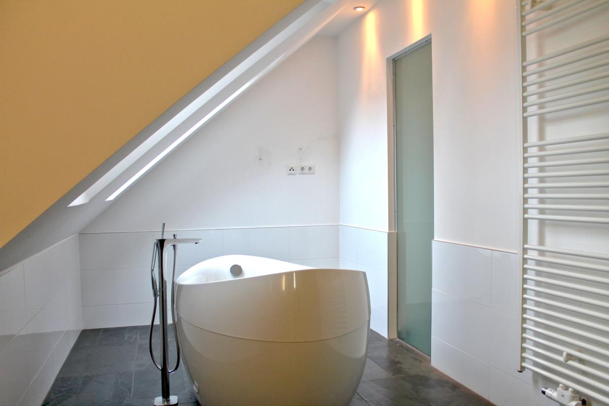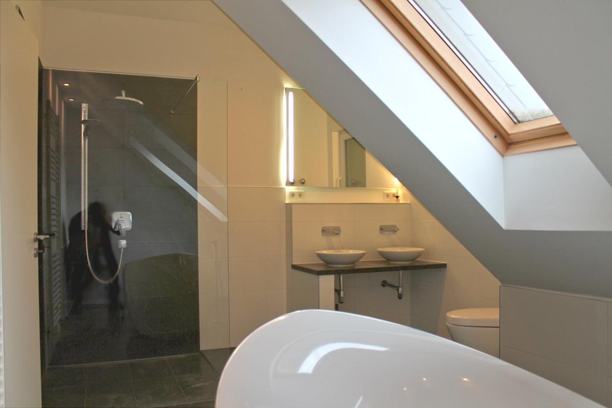 Das Tageslichtbad bietet neben einer geräumigen Dusche mit der freistehenden ovalen Badewanne einen absoluten Hingucker.