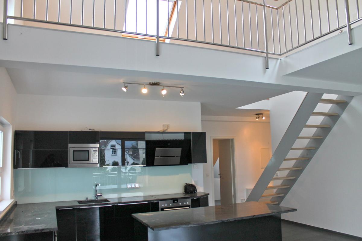 Der Wohnbereich mit der modernen Küche und der darüberliegenden Galerie ist ein absoluter Blickfang. Der helle Wohnraum ist nach Süden ausgerichtet und der vorhandene Balkon lässt den Blick ins Grüne zu.