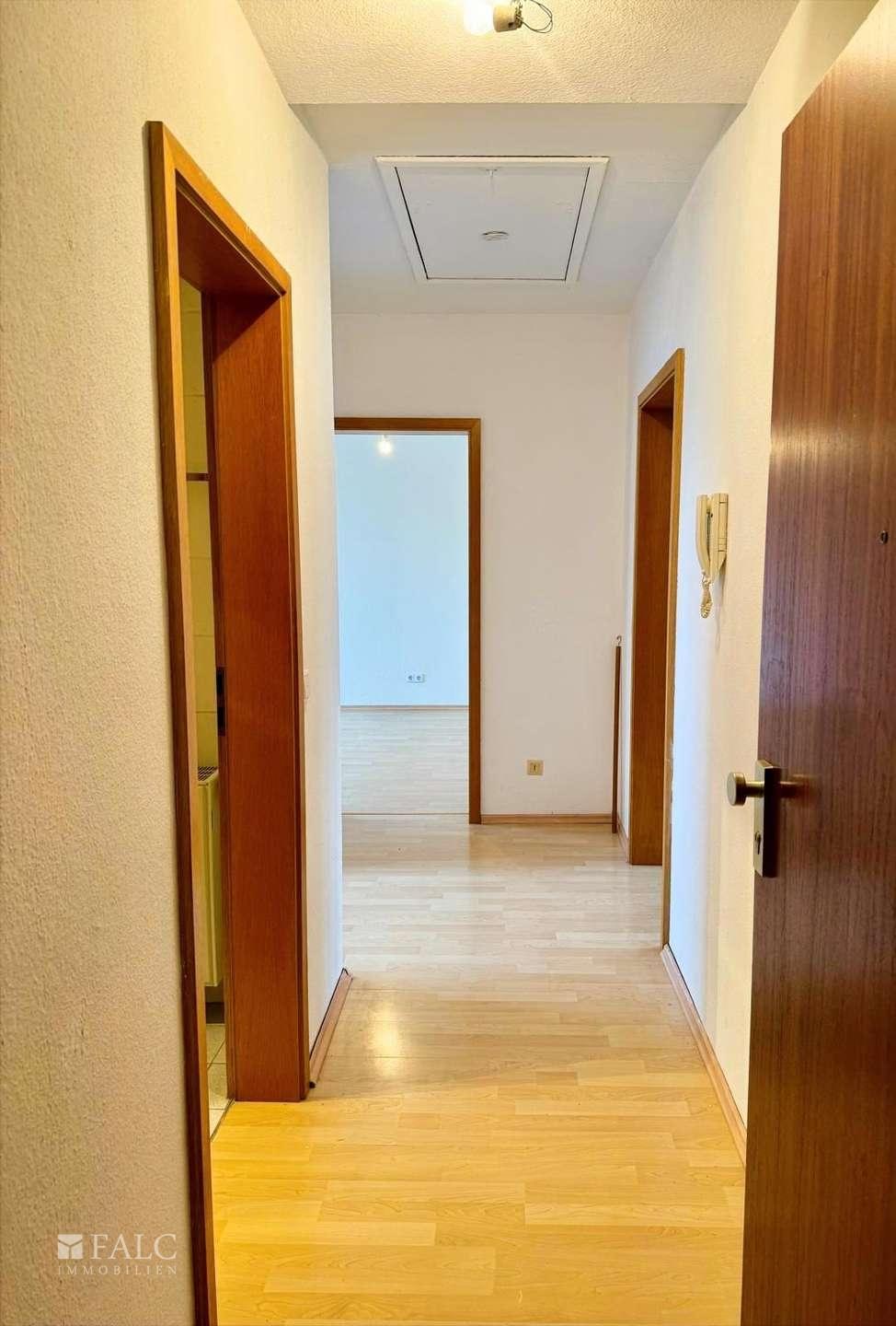 Hinter der Wohnungstür öffnet sich ein zentraler Flur, der als klare Achse in alle Räume führt und den Zugang zum Dachboden über eine Ausziehleiter ermöglicht. Die Raumaufteilung ist effizient geplant, sodass keine Wohnfläche durch unnötige Verkehrswege verloren geht.