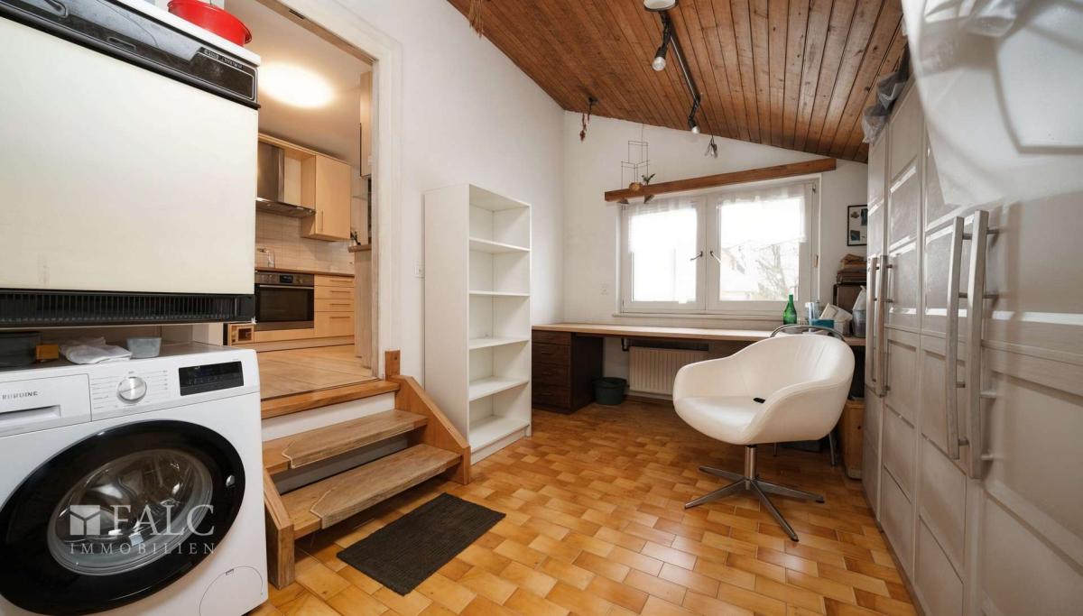 Die Wand zwischen Küche und Esszimmer wurde geöffnet, so dass Sie nun von einer offenen Wohnatmosphäre profitieren. Ein sich an der Küche anschließender Raum schafft die Möglichkeit eines Hauswirtschaftsraumes. Schließen Sie einfach die Tür, wenn Sie Besuch erhalten, Sie müssen nicht erst alles verräumen. Von hier aus gelangen Sie ebenfalls in den Garten, was gibt es besseres, als sich während dem Kochen direkt aus dem Kräuterbeet versorgen zu können!