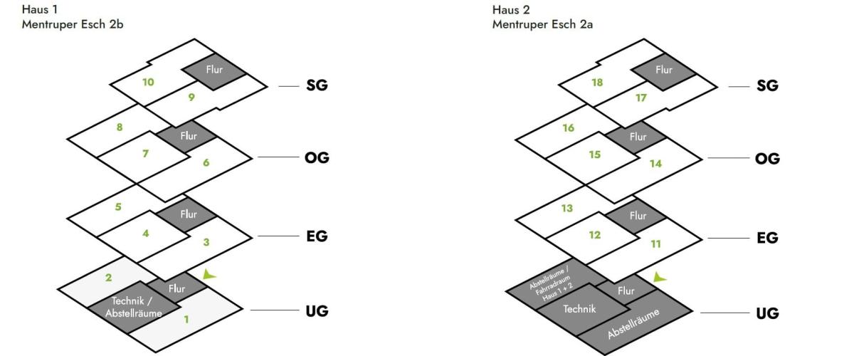 Das Grundstück ist sowohl vom Mentruper Esch als auch vom Dreskamp aus erschlossen und befahrbar. Die Parkplätze sind ebenfalls auf beiden Seiten des Grundstücks platziert. Im Inneren der Anlage verbindet ein gemeinschaftlich nutzbarer Gartenbereich die beiden Gebäude. Er schafft Raum für Rückzug und Begegnung – und steht allen Bewohnerinnen und Bewohnern offen.