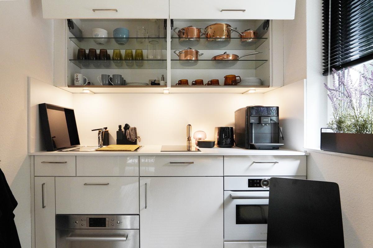 Ein weiteres Highlight ist sicherlich die Einbauküche, die voll ausgestattet angeboten wird. Weiße Fronten mit dezenten Griffen, Marken Edelstahl-Backofen und Geschirrspüler, 2-Platten Glas-Kochfeld, LED Beleuchtung, Kaffeemaschine, Wasserkocher, Toaster & Co. Dazu ein Set an hochwertigen Messing-Töpfen, Gläsern, Tassen, Tellern und Besteck. Die kleine Sitzecke mit zwei Stühlen und Tisch bietet ausreichend Platz für die täglichen Mahlzeiten.