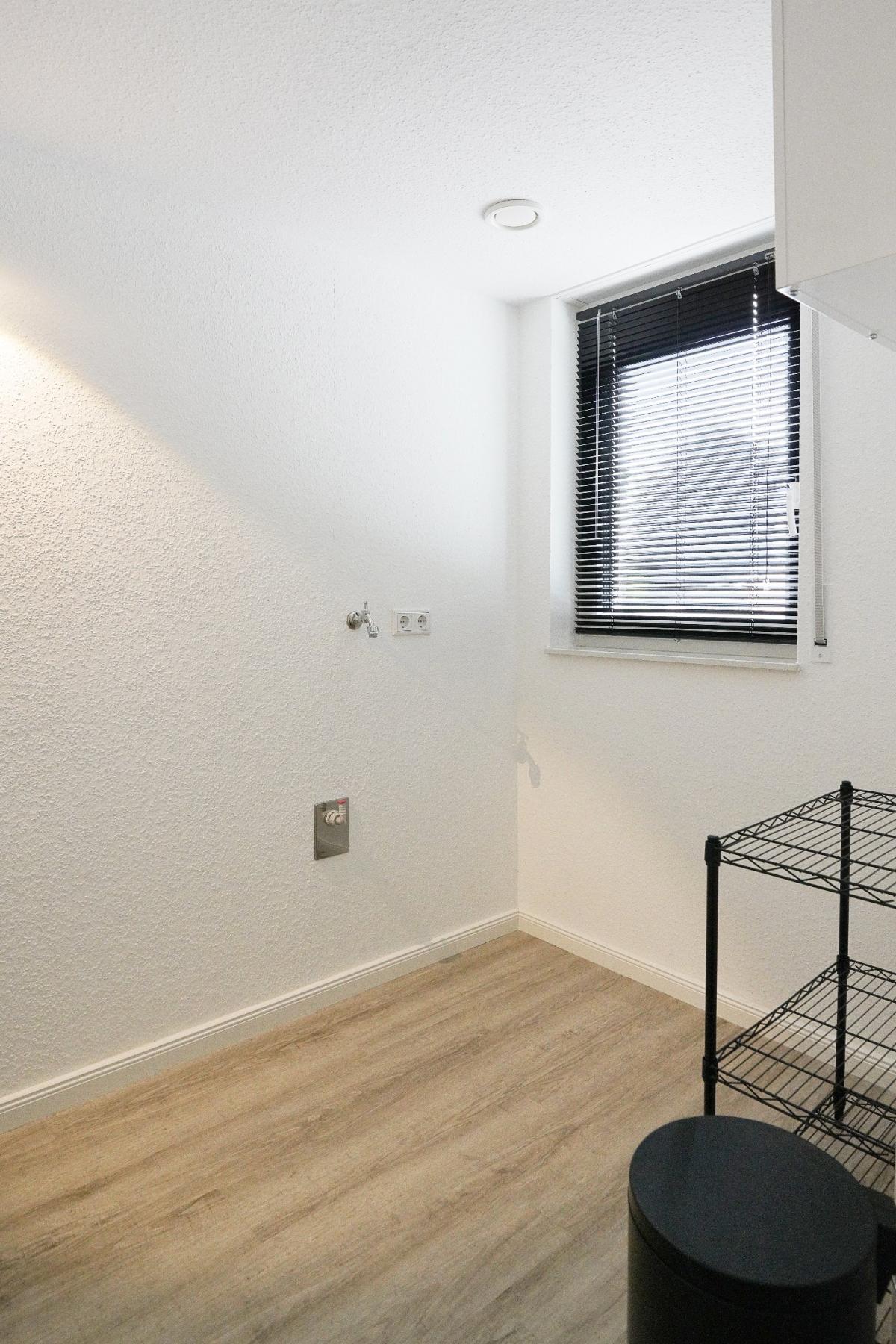 Von der Küche abgehend befindet sich ein Hauswirtschafts- bzw. Abstellraum, in dem auch Waschmaschine und Trockner untergebracht werden können. Diese sind ausnahmsweise nicht mit dabei. Im HWR stehen einige Regale, dezent hinter einem Vorhang versteckt, und ein Fuß-Tritteimer für Sie bereit.