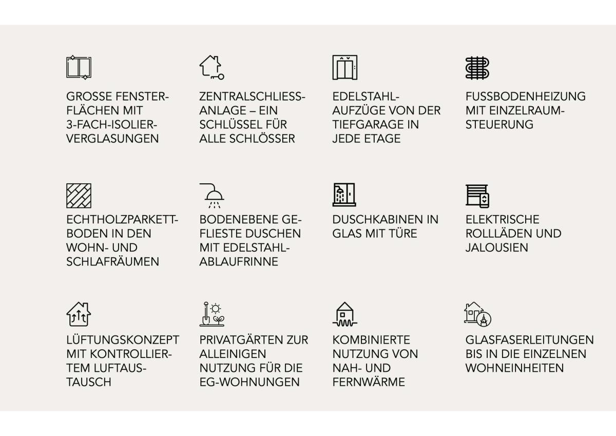 Eine sehr hochwertige Ausstattung erwartet Sie. Angefangen mit eine Echtholzparkettboden, Glasduschkabinen, elektrische Jalousien/Rollläden, Fußbodenheizung, ein durchdachtes Lüftungskonzept, Nutzung von Nah- und Fernwärme, Glasfaserleitungen, Tiefgarage, PV-Anlage und vieles mehr.