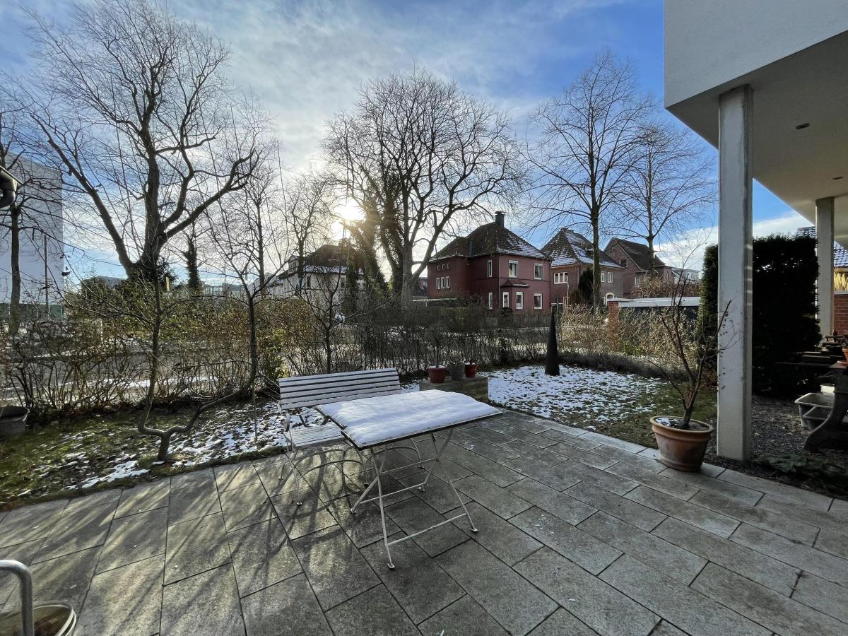 Zwei private Gärten mit Terrassen erweitern den Wohnraum nach außen und bieten Rückzugsorte mitten in der Stadt. Zur Wohnung gehören zudem eine Garage, ein zusätzlicher Tiefgaragenstellplatz sowie ein eigener Kellerraum.