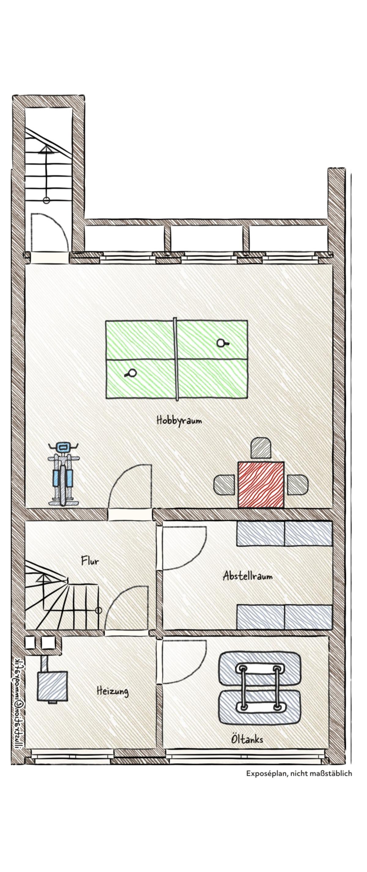 Das Reihenhaus besticht durch seine attraktive Architektur und die durchdachte Raumaufteilung. Gleichwohl ist eine umfassende Grundrenovierung dieses Reihenmittelhauses erforderlich, wie sie in den benachbarten Reihenhauseinheiten bereits erfolgt ist. Neben dem Austausch der straßenseitigen Fenster sollten auch ein Heizungstausch (aktuell Ölheizung von 1995), eine Erneuerung des Bades und WCs und eine Modernisierung der Elektroinstallation einkalkuliert werden. Umfangreiche Maler- und Bodenbelagsarbeiten sind nach dem Auszug des Mieters erforderlich.