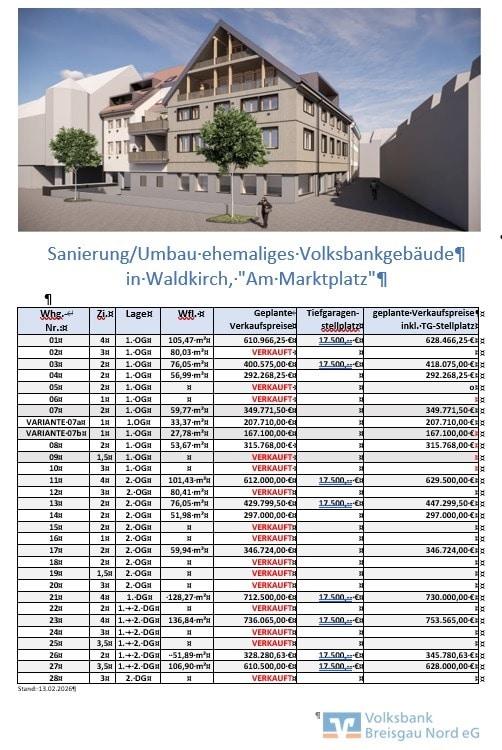 In unserem ehemaligen Bankgebäude am Marktplatz entstehen insgesamt 28 Wohnungen sowie zwei gewerbliche Einheiten. Eine dieser Einheiten wird von uns genutzt, während die andere von der Stadt Waldkirch in Anspruch genommen wird. Die umfassende Sanierung der Immobilie wird in den kommenden zwei Jahren von Handwerkern, größtenteils aus der Region, durchgeführt.