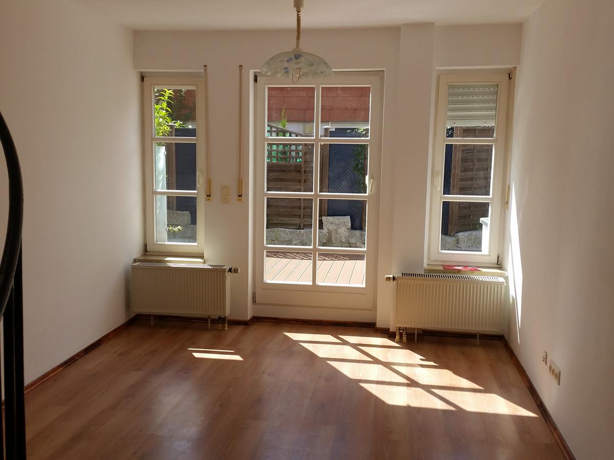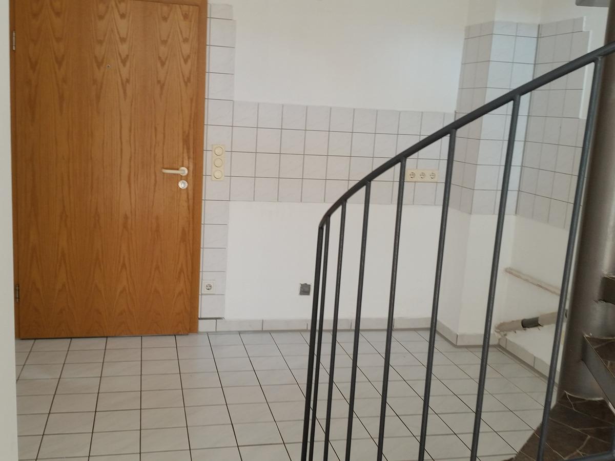 Forchheim Buckenhofen Wohnung 58 qm, Pautzfelder Str., incl. großer Terrasse im EG und Balkon im 1. Stock, Wendeltreppe über 3 Stockwerke, also offene Wohnung, alle Fenster Südseite, Badewanne und Dusche im Bad mit zusätzlichem Fenster im 2. Stock Nordseite mit Tür, großer einzelner Kellerraum mit Türe, Waschmaschine im Gemeinschafts-Trockenkeller abstellbar und 1 Wäscheständer dort abstellbar und Trockner, Gemeinschafts-Fahrradkeller, Gemeinschafts-Garten vor dem Haus, ohne Küche. Küche muss im EG im Eingangsbereich eingebaut werden.