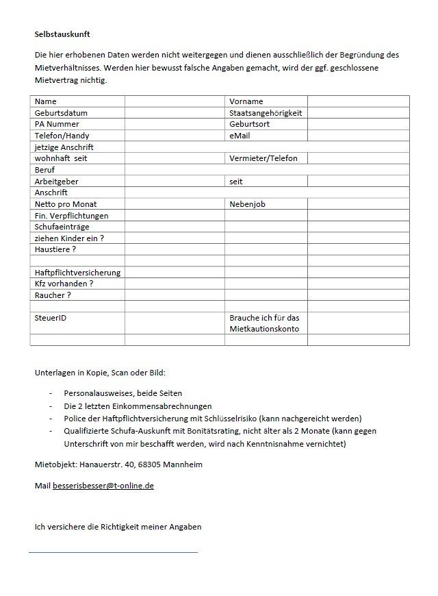 Bei den Bildern befindet sich eine Selbstauskunft, wenn Sie diese nicht ausfüllen können oder wollen, brauch Sie nicht weiterzulesen. Besichtigungen gibt’s nur, wenn ich die Selbstauskunft habe.