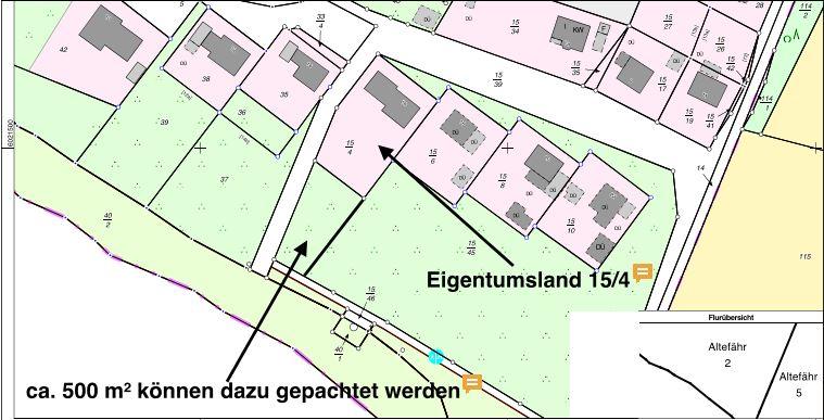 Das Objekt besteht aus einem Kaufgrundstück mit 958m² und einem Pachtgrundstück zum Wasser hin mit ca. 500m². Die Jahrespacht beträgt ca. 400€.