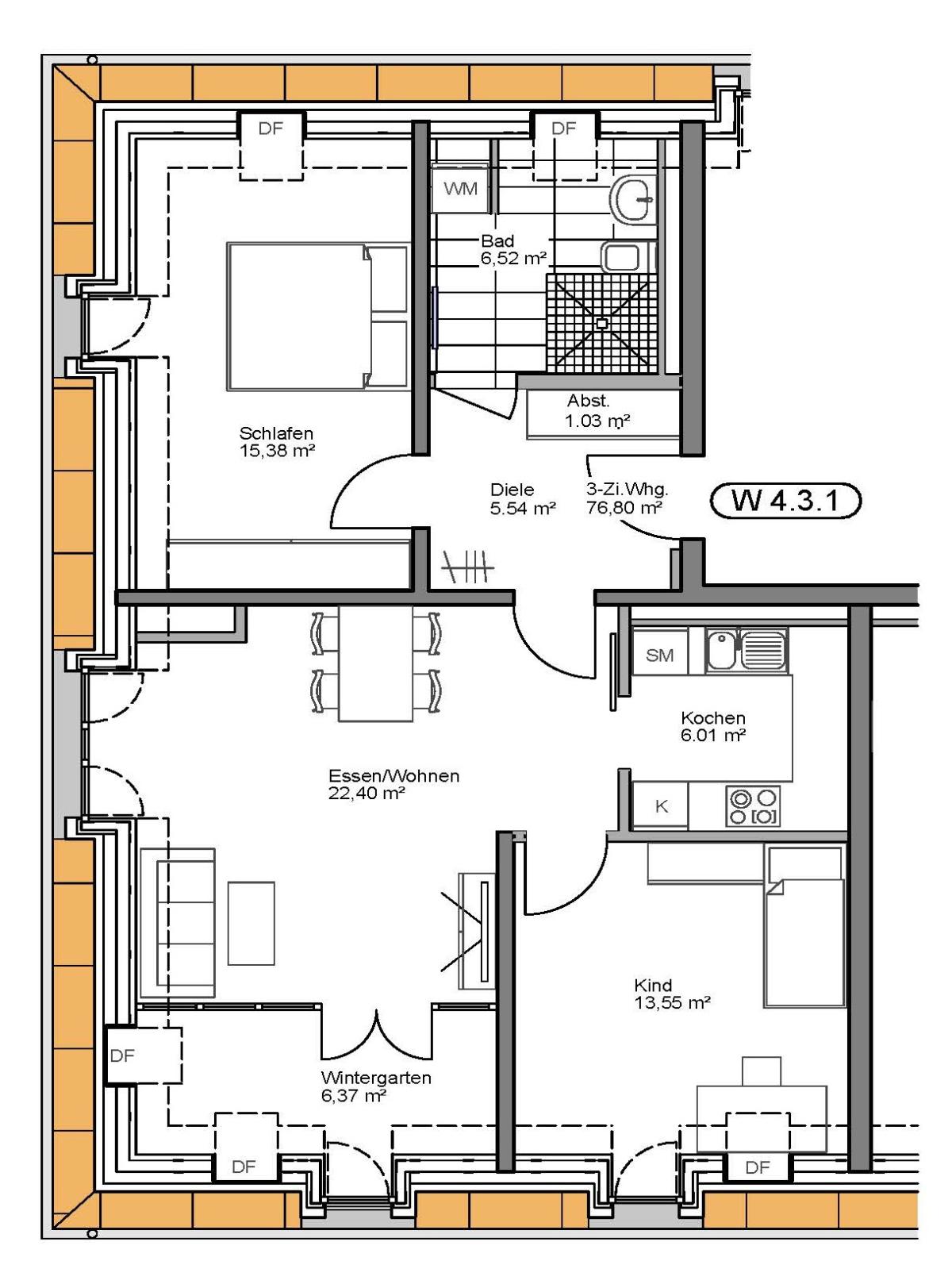 3-Zimmer-Wohnung (Nr. 4.3.1) gefördert - Wohnberechtigungsschein Stufe 1 EOF erforderlich