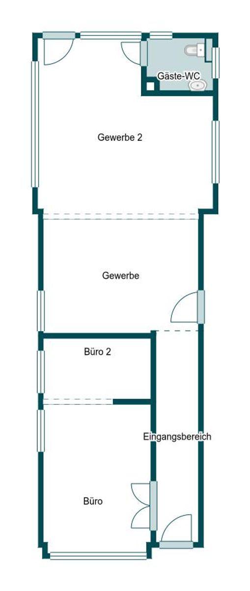 Der Grundriss ist klar strukturiert und äußerst funktional: Ein Empfangs- und Büroraum empfängt Kunden direkt über den straßenseitigen Eingang, gefolgt von einem großzügigen Gewerbe- bzw. Aufenthaltsraum mit viel natürlichem Licht und der Möglichkeit eine Küche anzuschließen. Ergänzt wird das Ensemble durch ein Gäste WC sowie einen zusätzlichen hinteren Ausgang, der direkten Zugang zum Hof und damit zu den Fahrzeugen ermöglicht – ideal für Fahrschulen, Dienstleister oder Gewerbetreibende mit Kundenverkehr.
