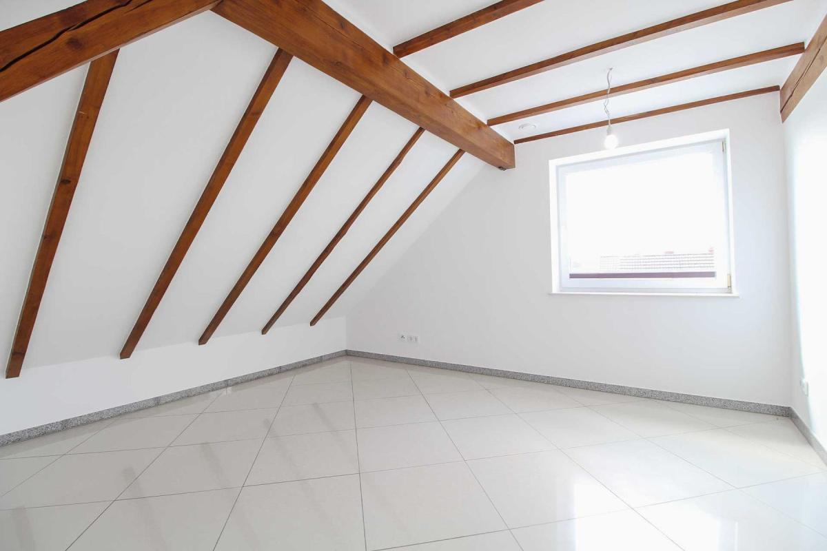 Das Tageslichtbad ist hochwertig gestaltet und fügt sich harmonisch in den durchdachten Grundriss ein. Helle Räume mit sichtbaren Holzbalken unterstreichen den charmanten Dachgeschosscharakter. Von hier aus gelangen Sie direkt auf die großzügige Dachterrasse, die zusätzlichen Freiraum im Außenbereich bietet.