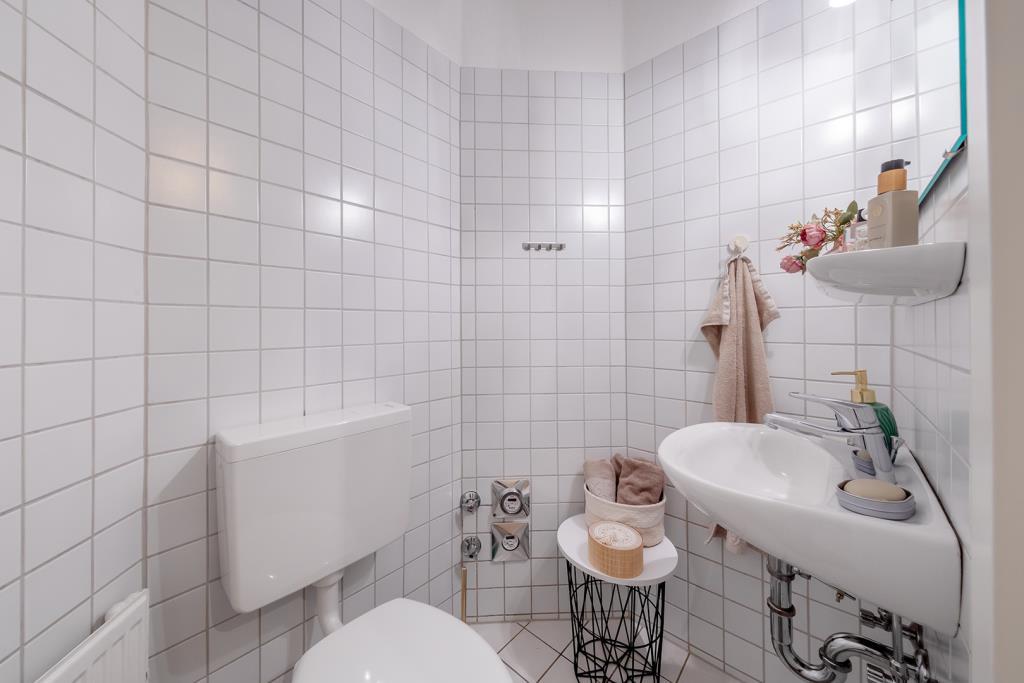 Rechter Hand gelangen Sie in das Gäste-WC, welches mit weißen Sanitärobjekten sowie hellen Boden- und Wandfliesen ausgestattet ist. Eine elektrische Lüftungsanlage sorgt für die Be- und Entlüftung.