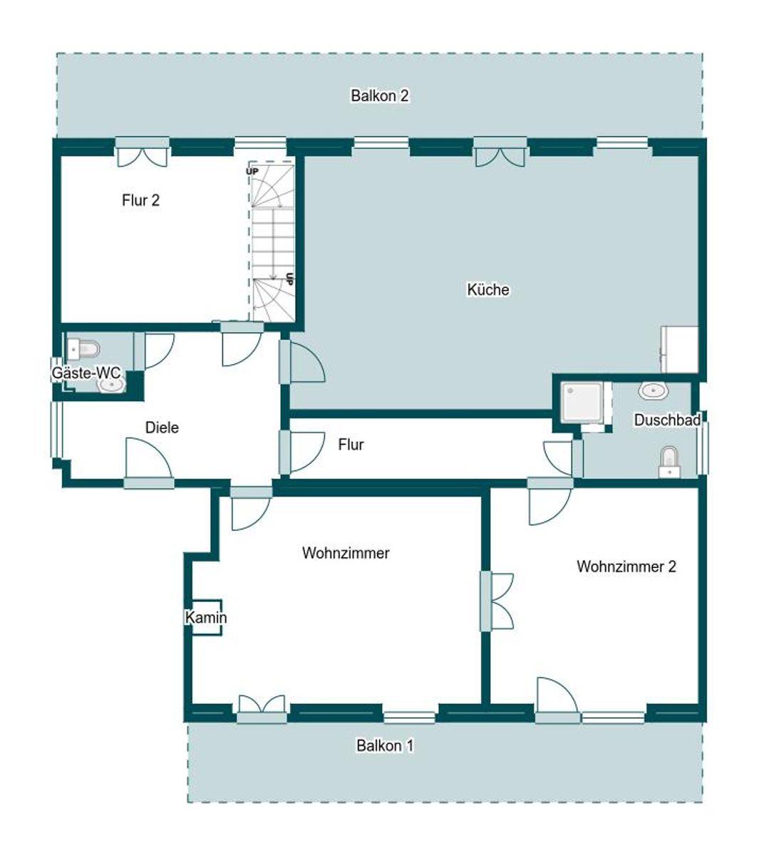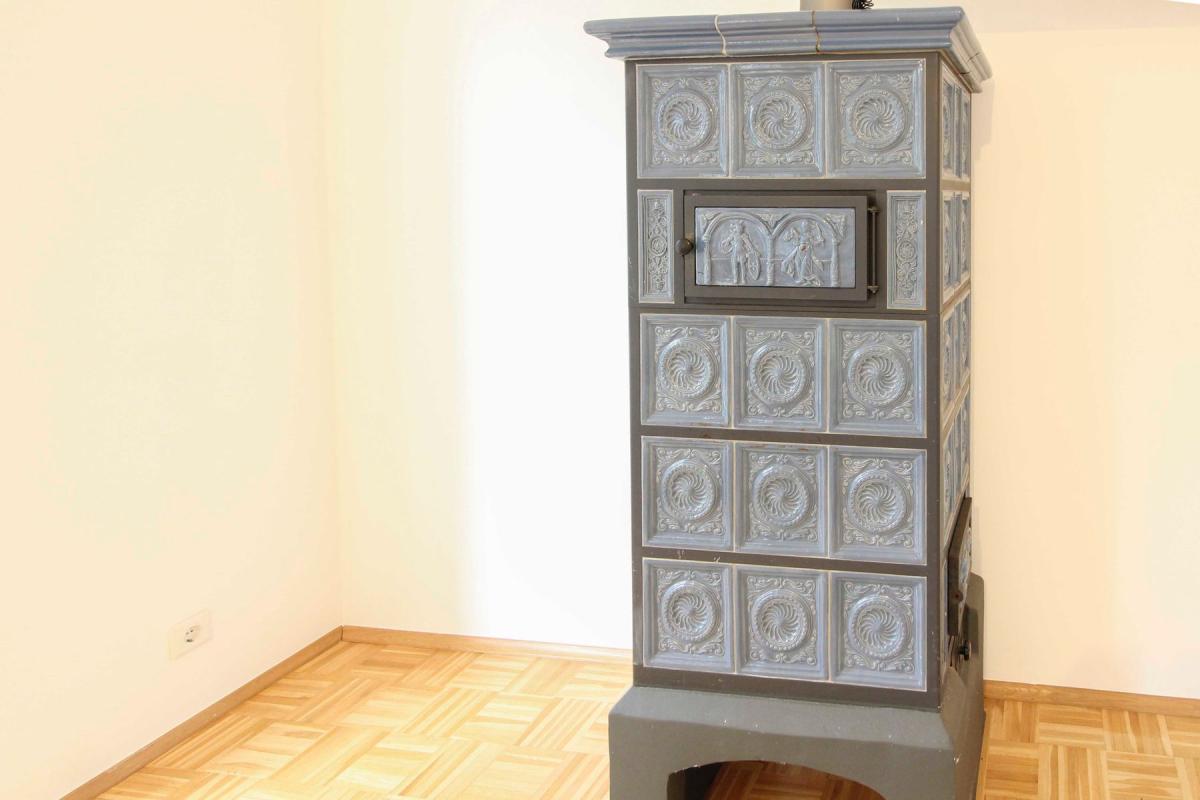 Im ersten Obergeschoss befindet sich der helle Wohnbereich mit charmantem Kachelofen und direktem Zugang zum sonnenverwöhnten Balkon, der sich fast über die gesamte Hausfront erstreckt. Hier lässt sich die Ruhe genießen – ein Ort, der das Wohngefühl ins Freie erweitert. Eine Wendeltreppe führt vom Balkon hinab in den idyllischen Garten, der eine grüne Oase mitten im Ort bildet. Der Wohnbereich erweitert sich um ein weiteres helles Zimmer, das sich ideal als Schlaf-, Arbeits- oder Gästezimmer eignet. Ein weiteres Highlight ist die großzügige Wohnküche: Sie bietet reichlich Platz für eine Traumküche und einen großen Esstisch, bildet damit den kommunikativen Mittelpunkt der Wohnung und verfügt über einen eigenen Balkon. Ein modernes Duschbad sowie ein separates Gäste-WC ergänzen diese Ebene.