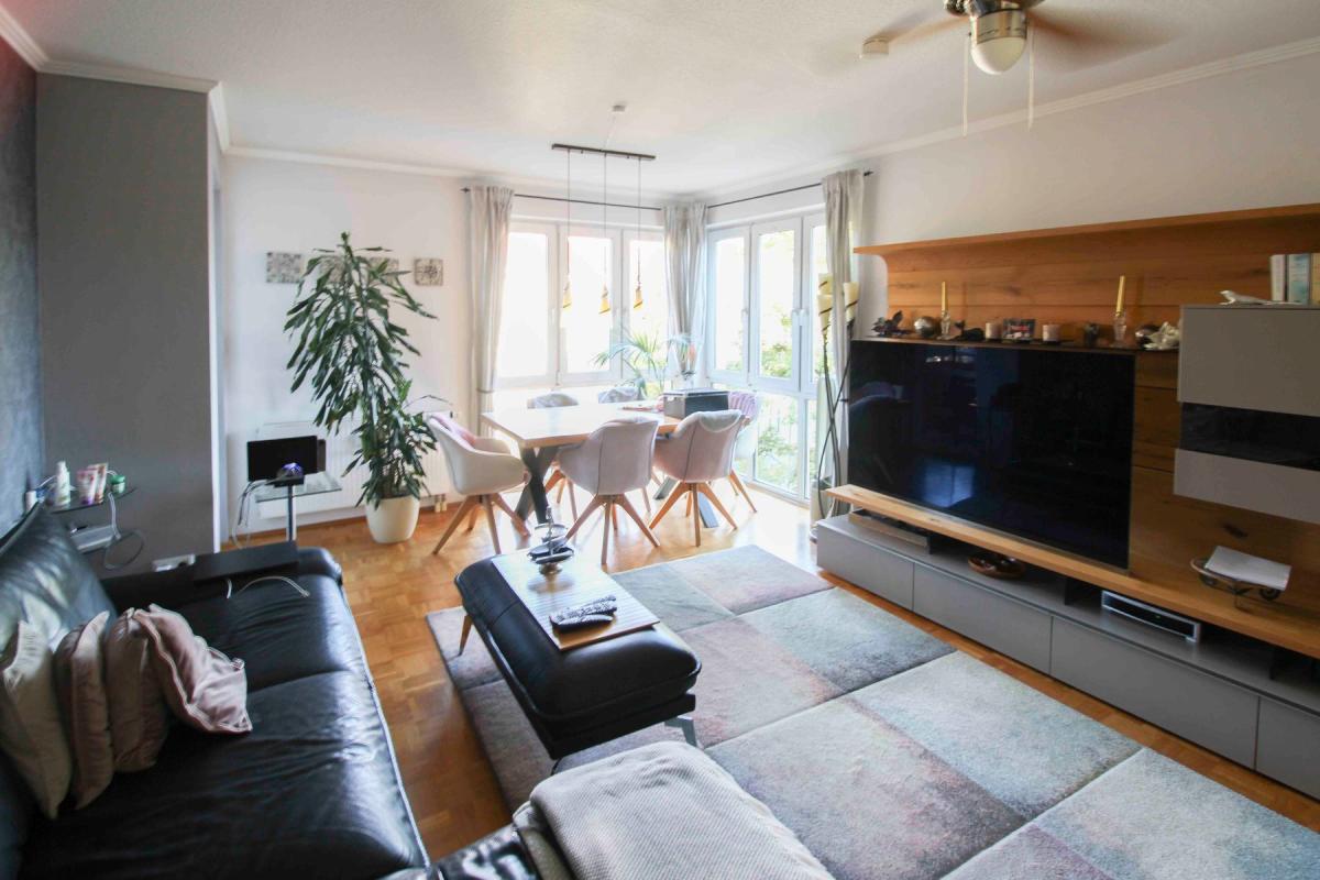 Bequem erreichbar über den hauseigenen Aufzug, liegt die Wohnung im 4. Obergeschoss eines viergeschossigen Mehrfamilienhauses. Auf rund 97 m² Wohnfläche stehen 3,5 Zimmer zur Verfügung, darunter zwei Schlafzimmer, ein großzügiges Wohnzimmer mit Zugang zu Balkon und Loggia, sowie ein Badezimmer mit Dusche und Badewanne und ein separates Gäste-WC.