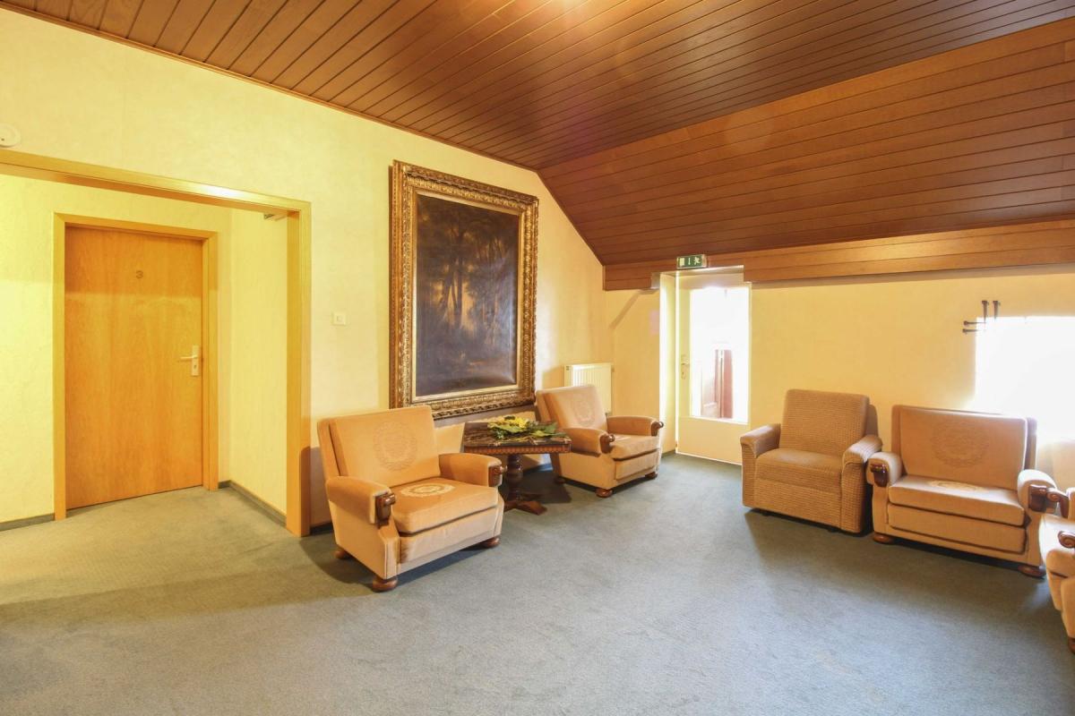 Besonders hervorzuheben ist der große Saal, der sich flexibel für Veranstaltungen, Seminare, kulturelle Formate oder alternative Nutzungskonzepte eignet. Ein ehemaliger Schwimmbadbereich eröffnet darüber hinaus weitere Perspektiven für Umbau oder Umnutzung.