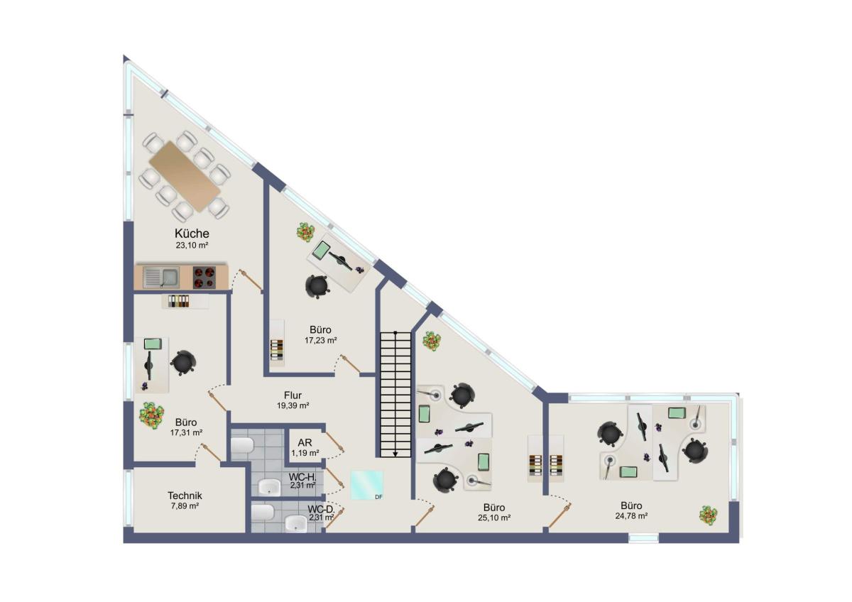 Das Büro mit einer Gesamtnutzfläche von ca. 150 qm teilt sich wie folgt auf: