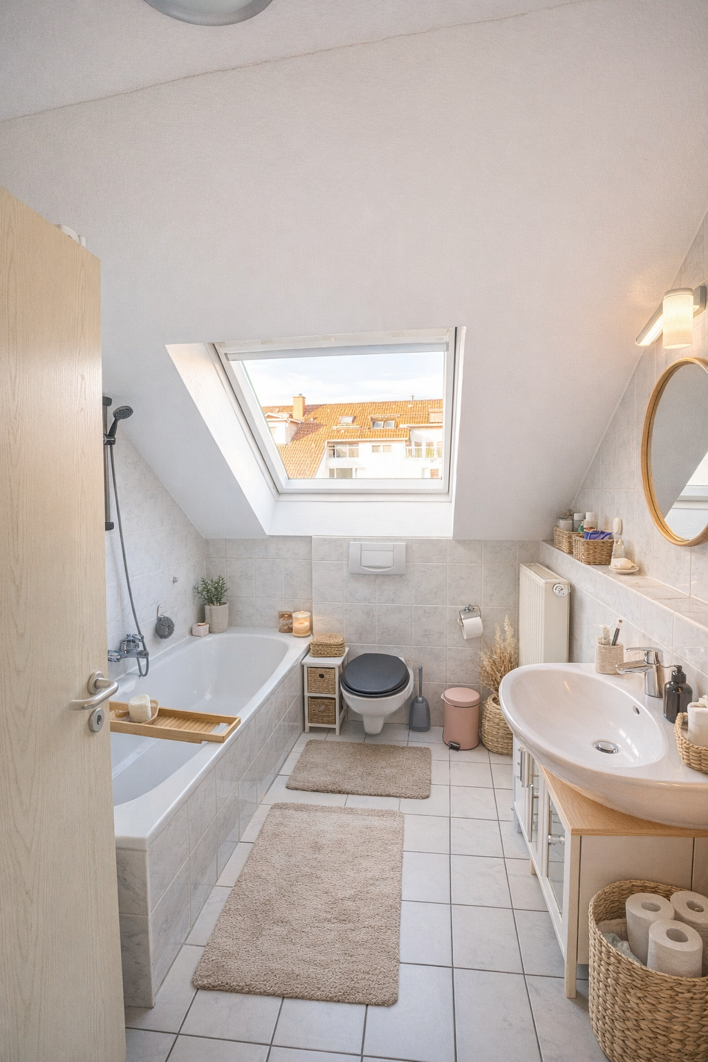 Die Wohnung verfügt insgesamt über drei Zimmer, die flexibel als Schlafzimmer, Kinderzimmer oder Homeoffice genutzt werden können. Das modern ausgestattete Badezimmer bietet sowohl eine Badewanne als auch eine separate Dusche. Ergänzend steht ein Gäste-WC zur Verfügung.
