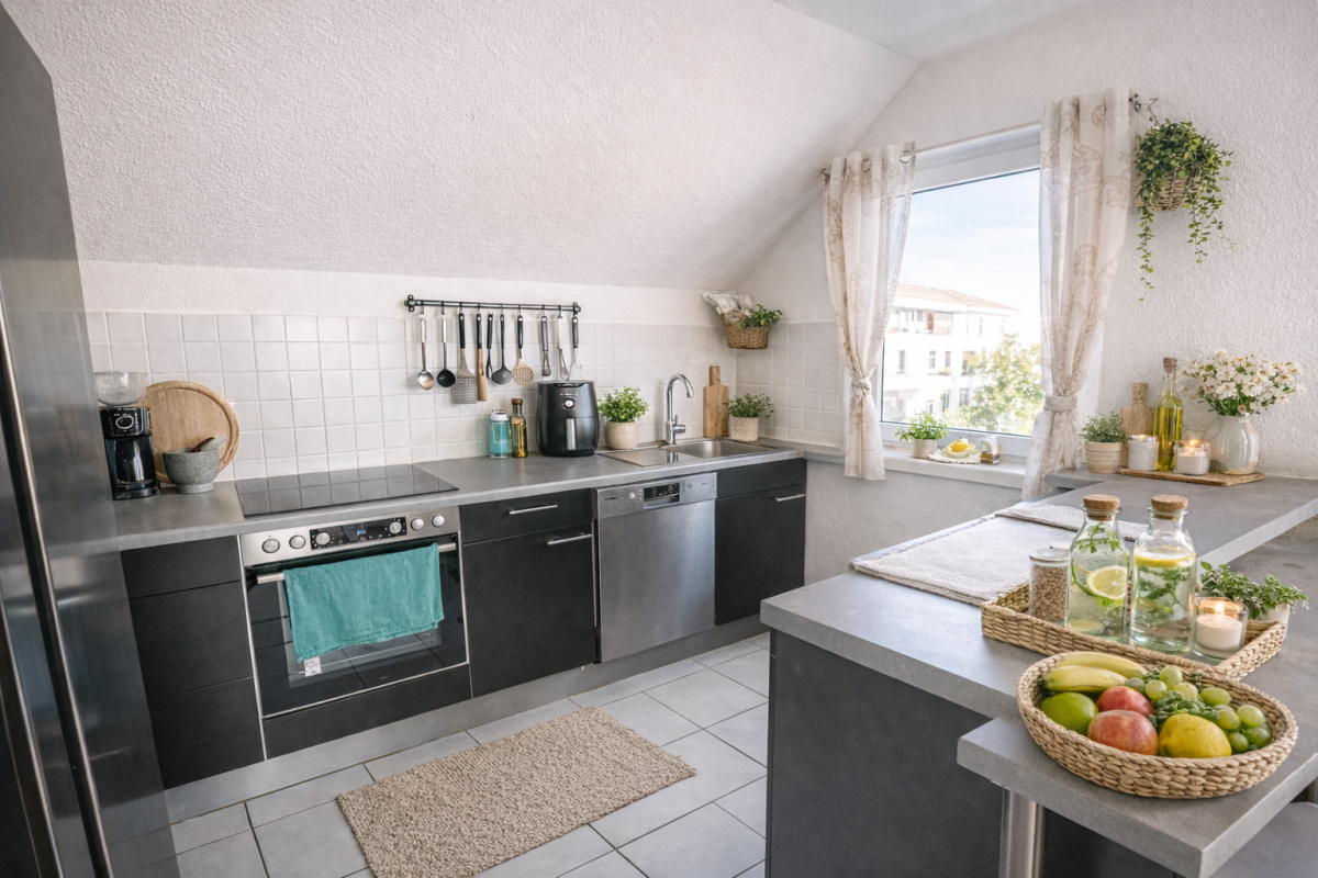 Der Mittelpunkt der Wohnung ist der großzügige Wohn- und Essbereich mit offener Küche, der Wohnen, Kochen und Zusammensein ideal verbindet. Von hier aus gelangen Sie direkt auf den großen Balkon, der ausreichend Platz für einen Esstisch, Pflanzen oder eine gemütliche Lounge-Ecke bietet und zum Verweilen im Freien einlädt.