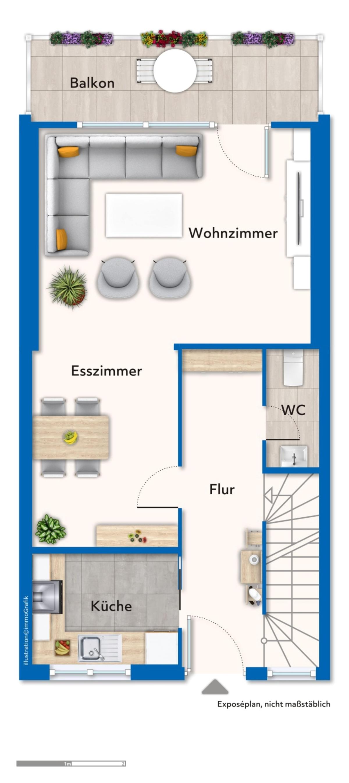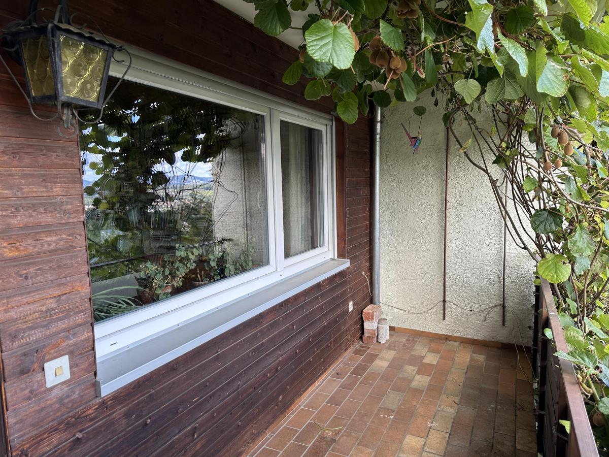 Terrasse, überdachter Balkon und Loggia bieten verschiedene Rückzugsorte im Freien. Vom Balkon aus genießen Sie einen schönen Weitblick über die Umgebung. Den kleinen aber feinen Garten können Sie ganz nach Ihren Wünschen neu gestalten.