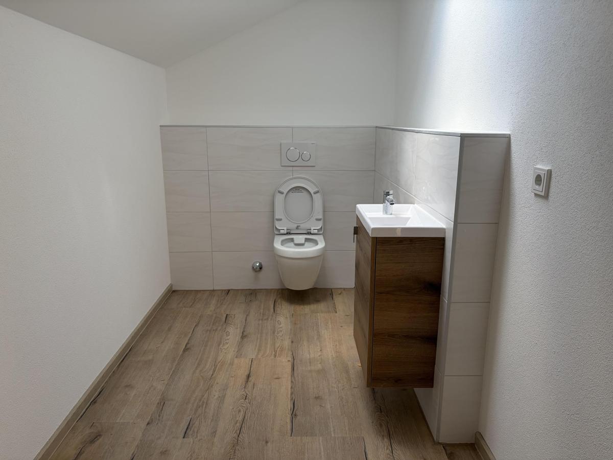 Das Obergeschoss verfügt über ein Gäste-WC sowie einen großen, hellen Wohnbereich. Ergänzt wird diese Ebene durch ein weiteres Zimmer, das sich ideal als Büro nutzen lässt.