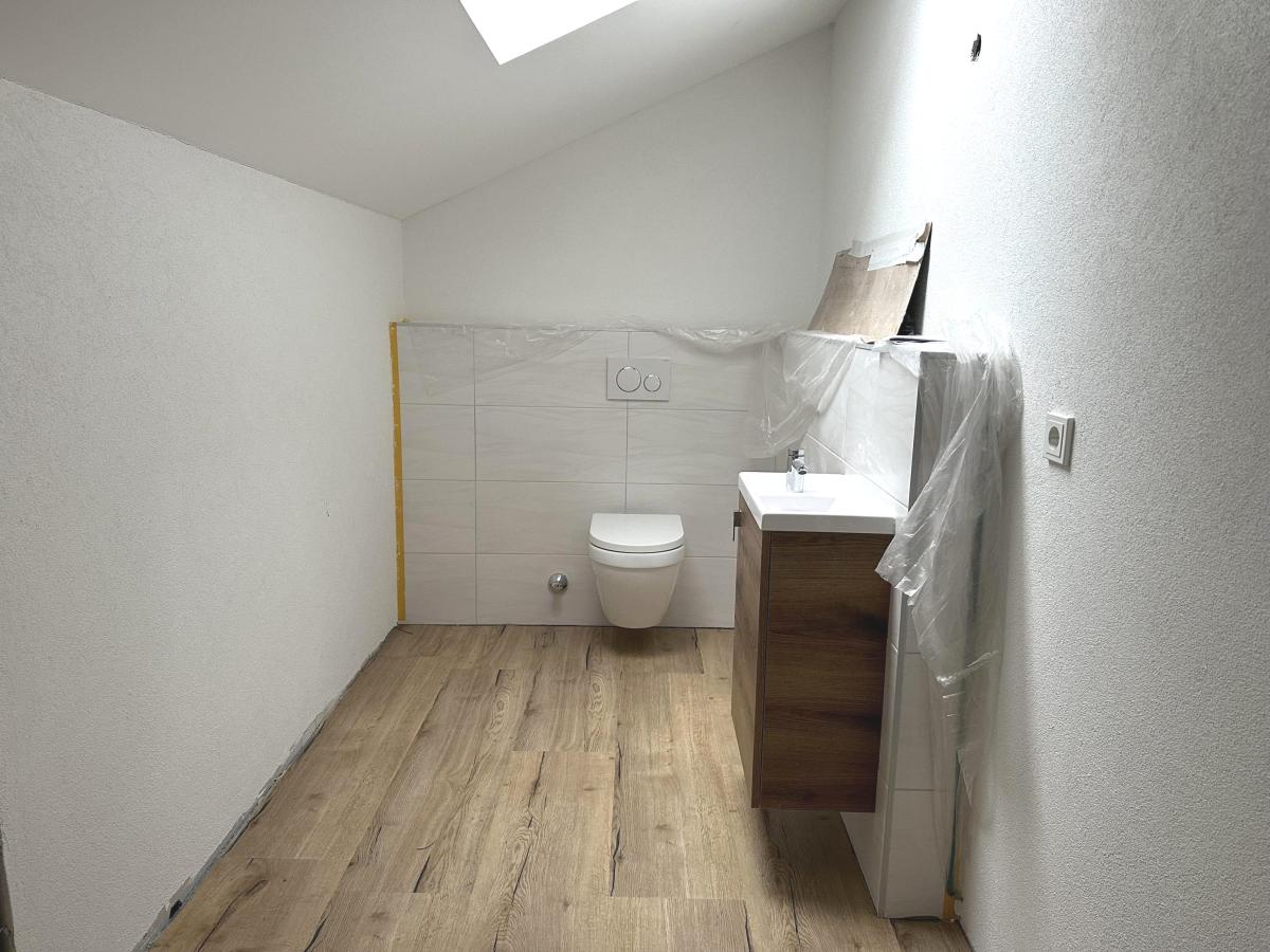 Das Obergeschoss verfügt über ein Gäste-WC sowie einen großen, hellen Wohnbereich, der vielfältige Nutzungsmöglichkeiten bietet. Ergänzt wird diese Ebene durch ein weiteres Zimmer, das sich flexibel als Büro, Kinder- oder Gästezimmer nutzen lässt.