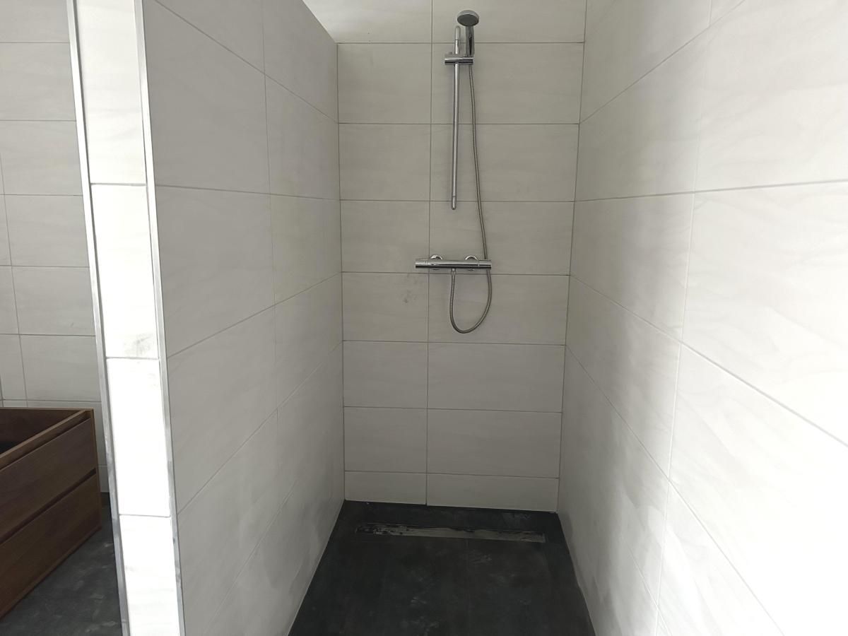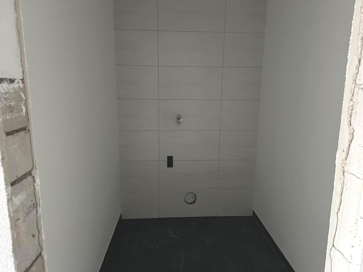 Im Erdgeschoss befinden sich ein Schlafzimmer, ein modernes Badezimmer mit begehbarer Dusche sowie ein separater Raum für Waschmaschine und Trockner. Zusätzlich gibt es einen Vorratsraum, der für praktischen Stauraum sorgt und einen separaten Abstellraum. Das Herzstück dieser Etage ist die große Küche mit Esszimmer, die offen gestaltet ist und direkten Zugang zur großzügigen Terrasse mit Blick ins grüne bietet.