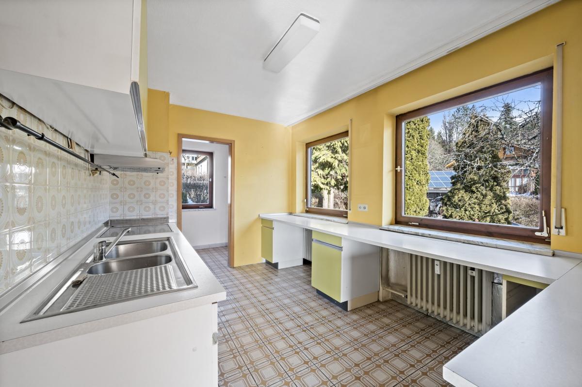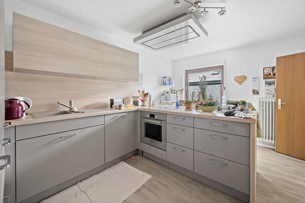 Die Küche bietet viel Platz, ein großes Fenster und einen praktischen Abstellraum.