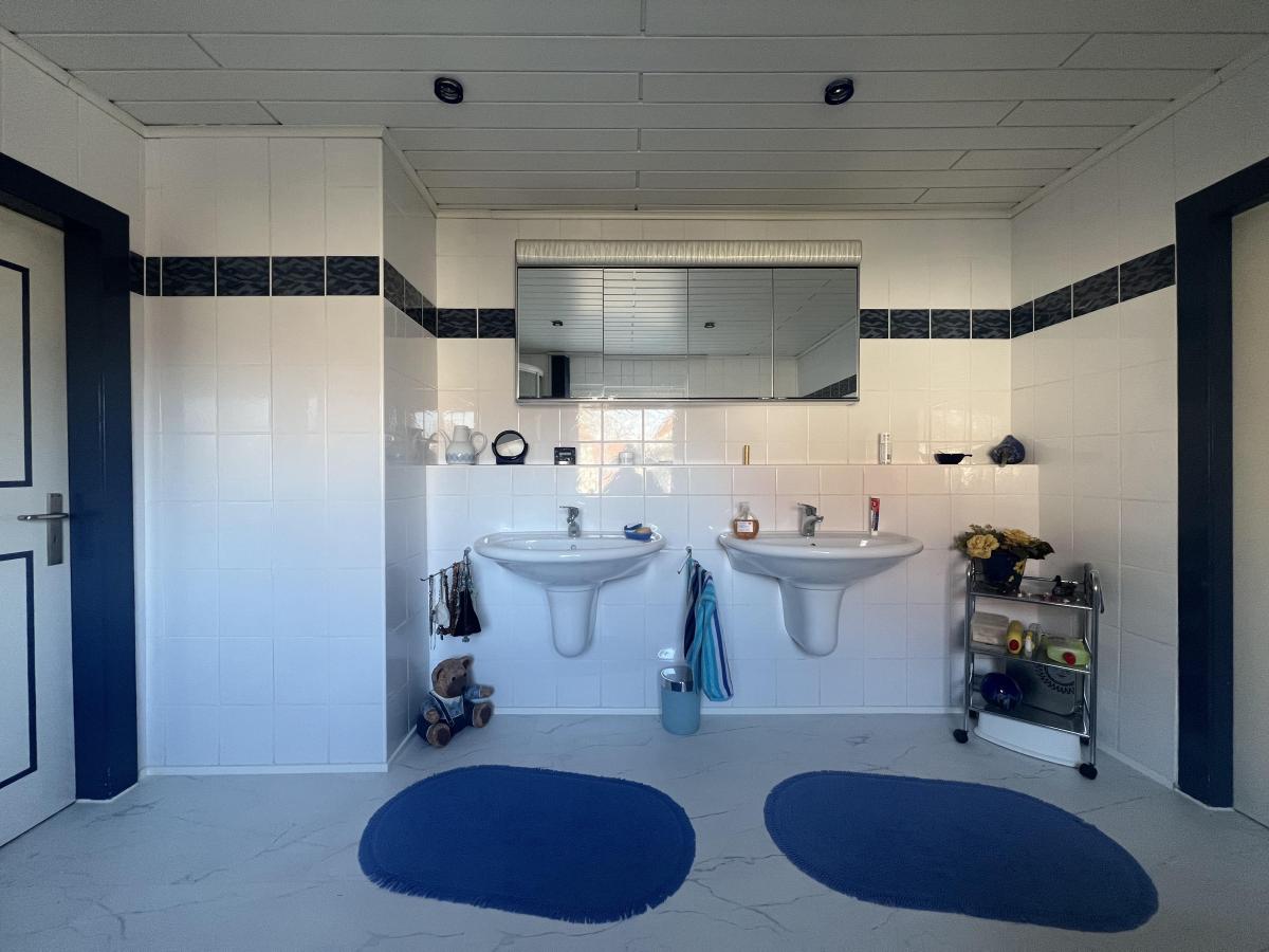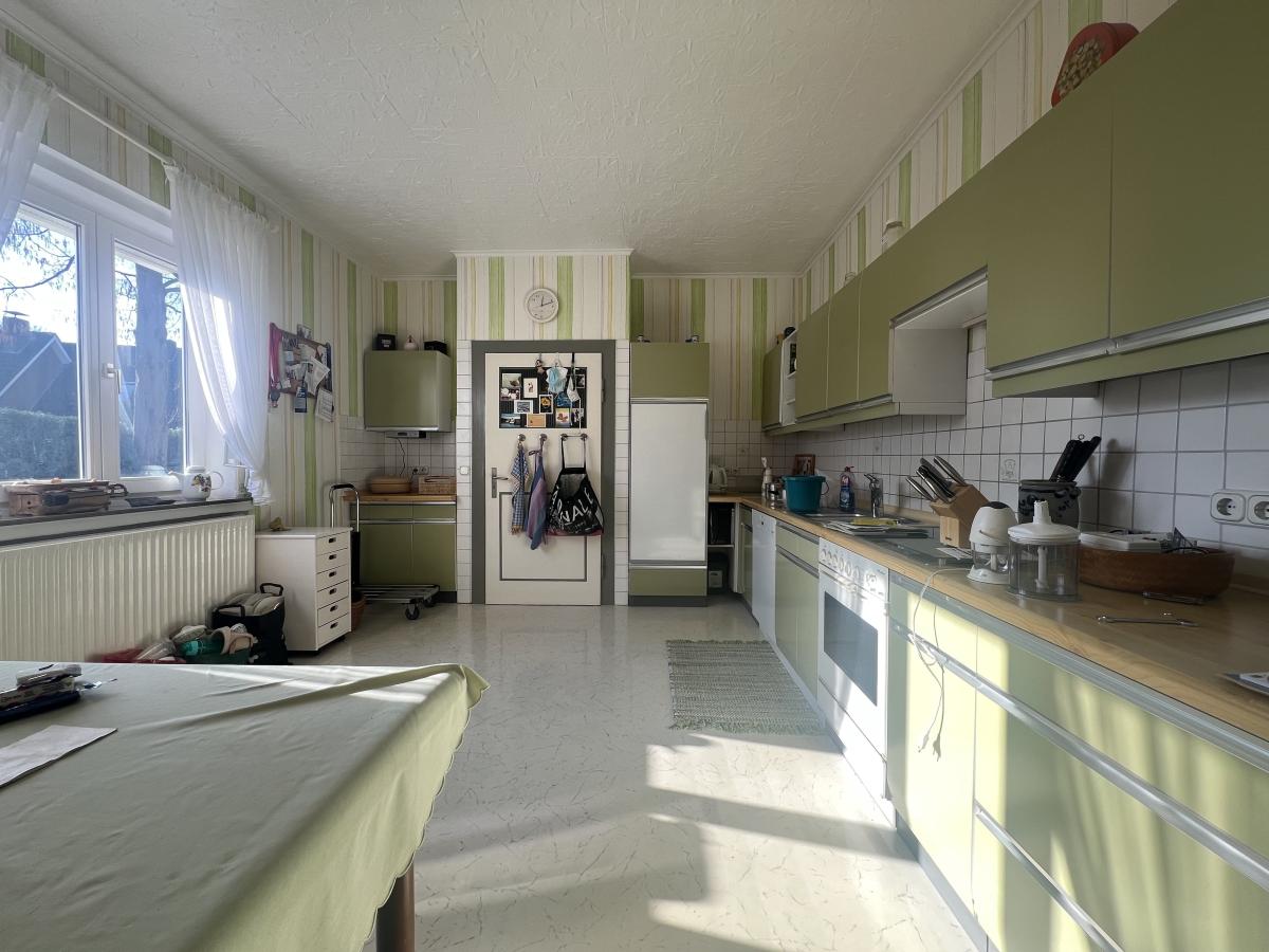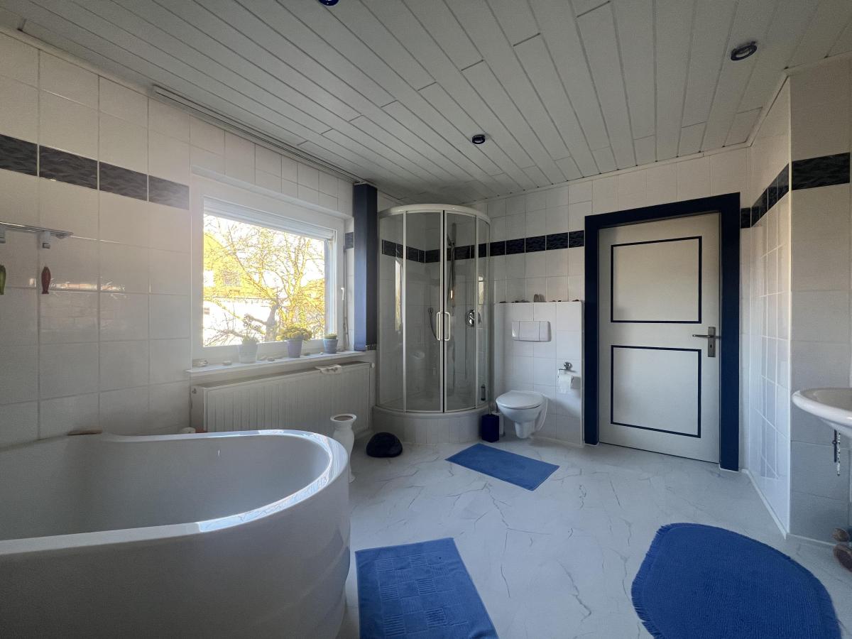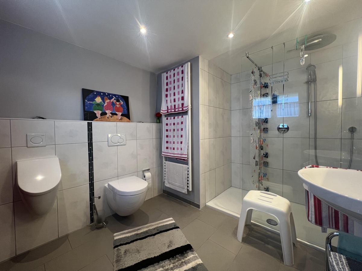 Die Raumaufteilung ist funktional gestaltet. Im Erdgeschoss befindet sich eine großzügige Küche sowie ein heller Wohn- und Essbereich mit direktem Zugang zur Terrasse. Von hier aus eröffnet sich der Blick in den Garten. Im Dachgeschoss stehen zwei Schlafzimmer zur Verfügung, die durch ein großzügiges Tageslichtbad mit Badewanne und Dusche voneinander getrennt sind. Zusätzlich befindet sich im Erdgeschoss ein weiteres, modernisiertes Badezimmer.