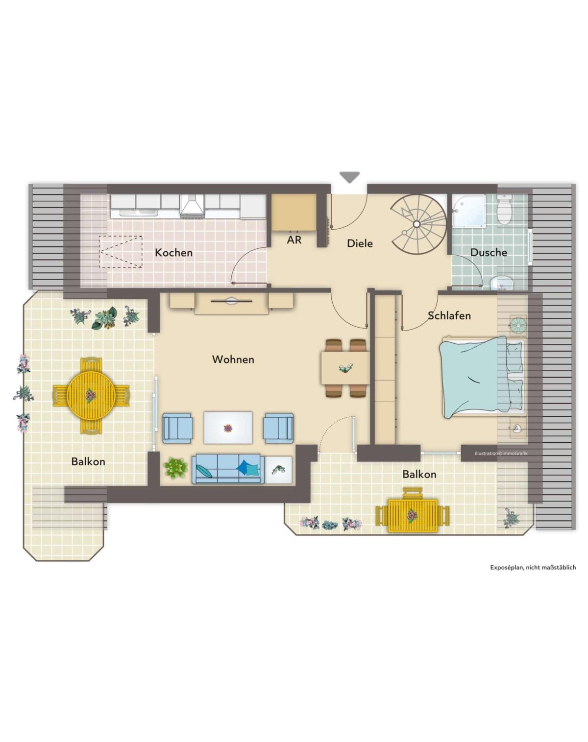 Ein geräumiger, teilweise überdachter Südbalkon mit Blick ins Grüne lädt zum Entspannen ein. Ergänzt wird die Wohnung durch einen weiteren Balkon mit Ost-Ausrichtung, der sowohl vom Wohn- als auch vom Schlafzimmer zugänglich ist.
