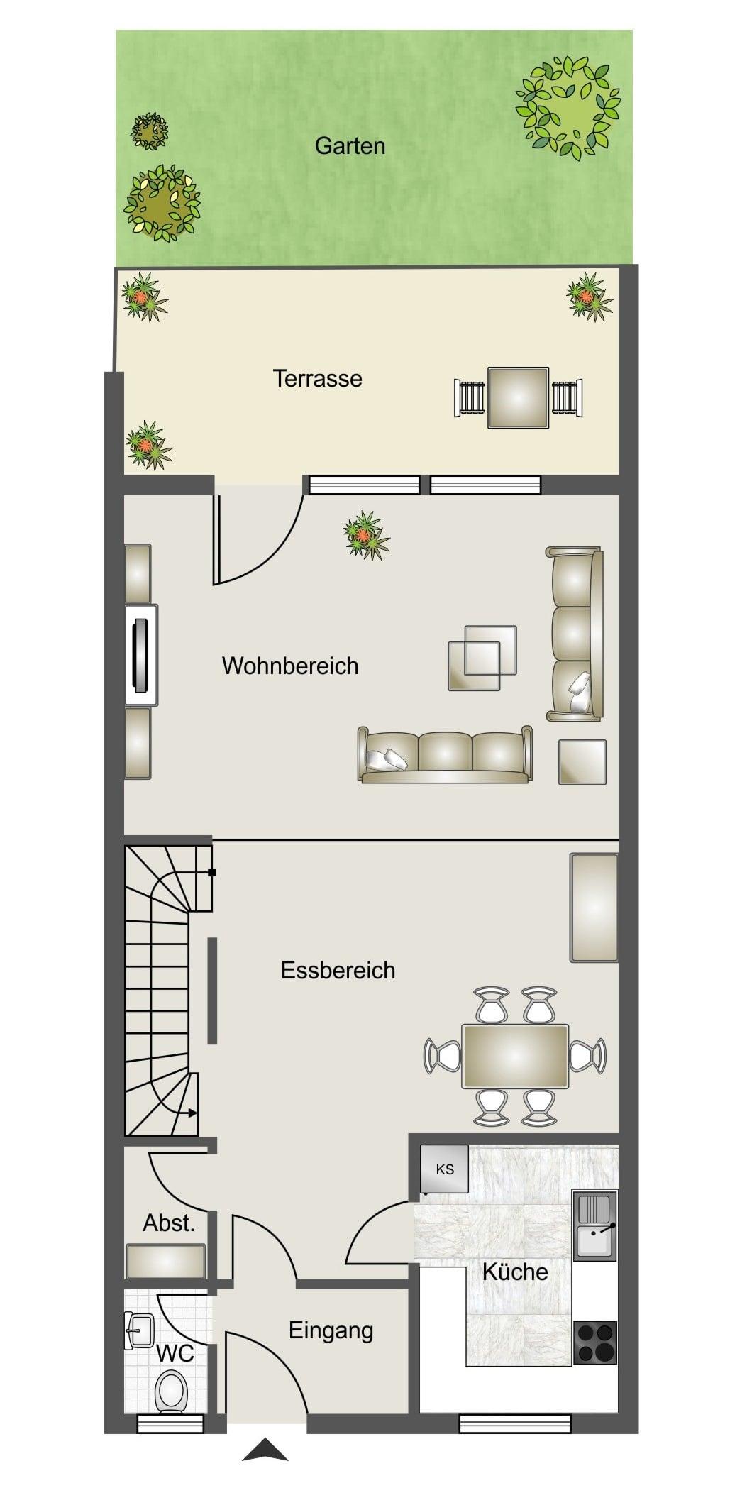 Im Erdgeschoss erreichen Sie über den Eingangsbereich das Gäste-WC, die Küche und das großzügige Wohn- und Esszimmer mit Zugang zur Terrasse und dem Garten.