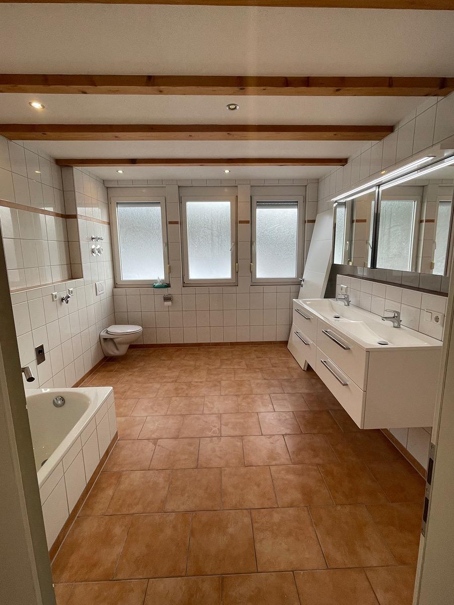 • Großes Badezimmer (links): Badewanne, WC, Doppelwaschbecken, helle Fliesen