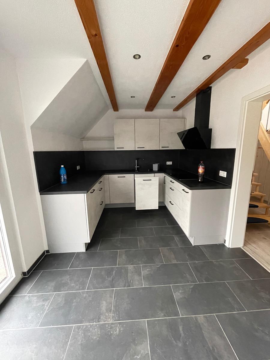 • In Bad und Küche: Fliesen (braun/beige bzw. dunkelgrau)